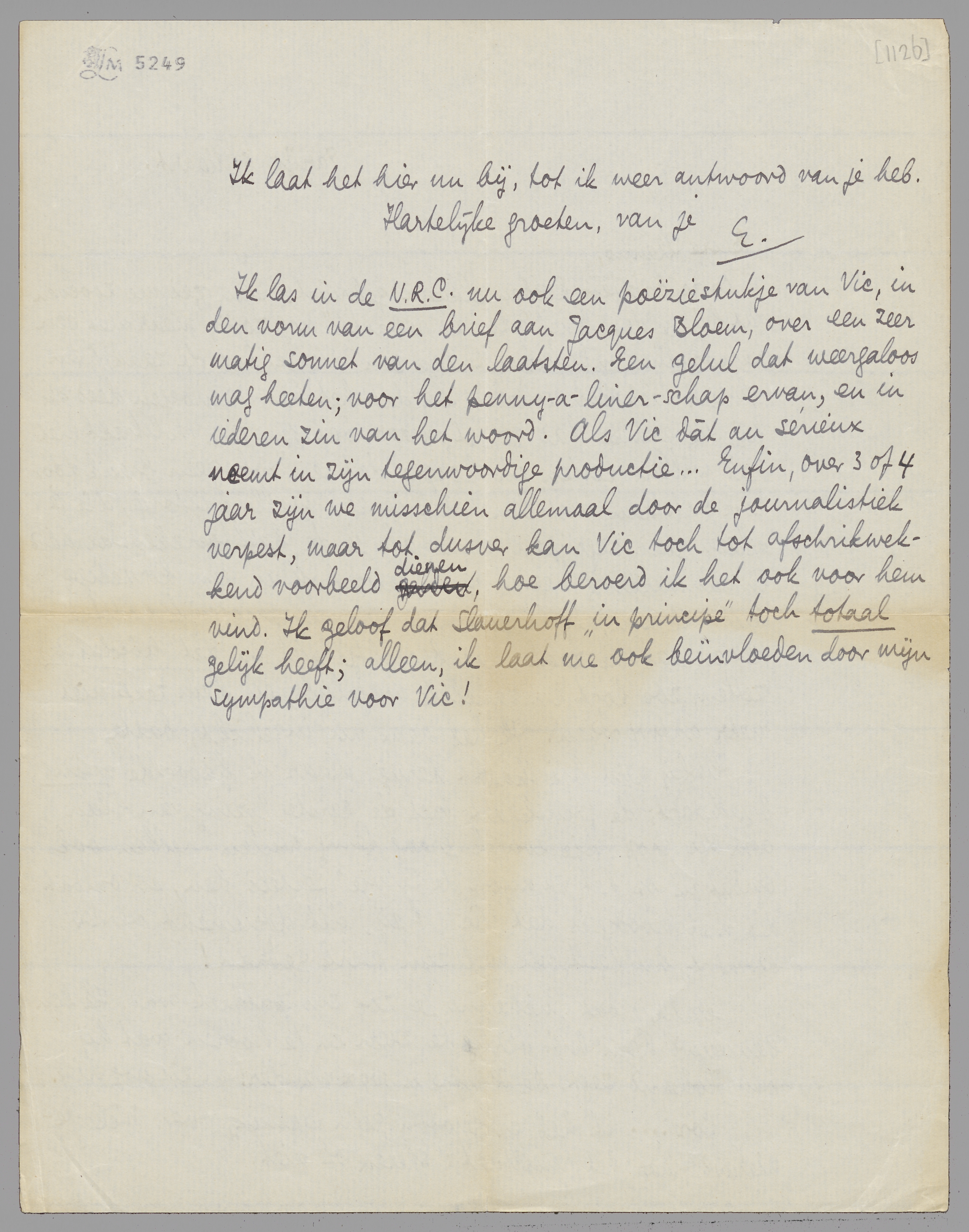 Ik las in de N.R.C. nu ook een poëziestukje van Vic, in den vorm van een brief aan Jacques Bloem, over een zeer matig sonnet van den laatsten. Een gelul dat weergaloos mag heeten; voor het penny-a-liner-schap ervan, en in iederen zin van het woord. Als Vic dàt au sérieux neemt in zijn tegenwoordige productie... Enfin, over 3 of 4 jaar zijn we misschien allemaal door de journalistiek verpest, maar tot dusver kan Vic tot afschrikwekkend voorbeeld dienen, hoe beroerd ik het ook voor hem vind. Ik geloof dat Slauerhoff ‘in principe’ toch totaal gelijk heeft; alleen, ik laat me ook beïnvloeden door mijn sympathie voor Vic!