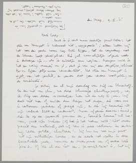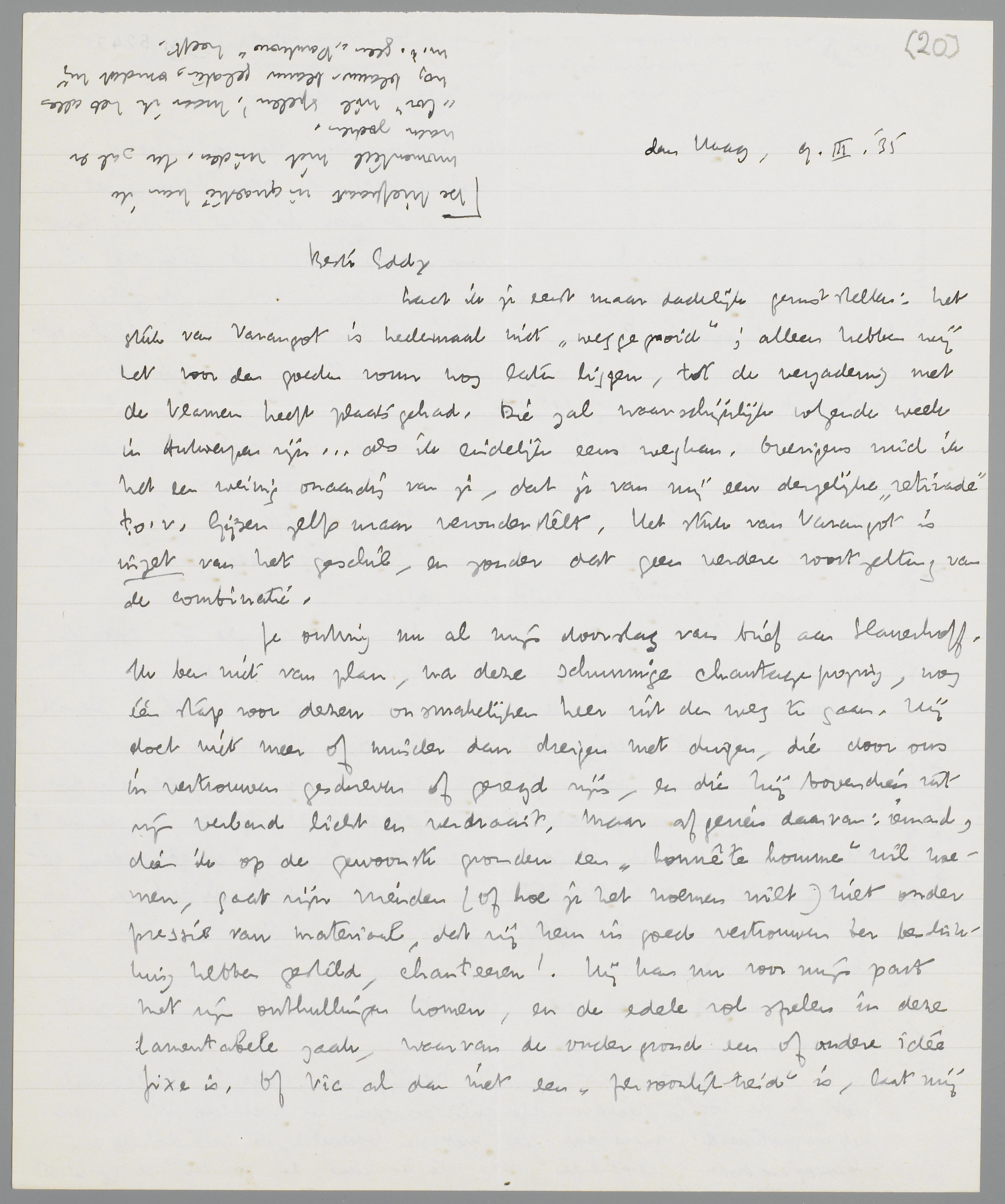 Laat ik je eerst maar dadelijk geruststellen: het stuk van Varangot is heelemaal niet ‘weggegooid’; alleen hebben wij het voor den goeden vorm nog laten liggen, tot de vergadering met de Vlamen heeft plaats gehad. Die zal waarschijnlijk volgende week in Antwerpen zijn... als ik eindelijk eens weg kan. Overigens vind ik het een weinig onaardig van je, dat je van mij een dergelijke ‘retirade’ t.o.v. Gijsen zelfs maar veronderstelt. Het stuk van Varangot is inzet van het geschil, en zonder dat geen verdere voortzetting van de combinatie.