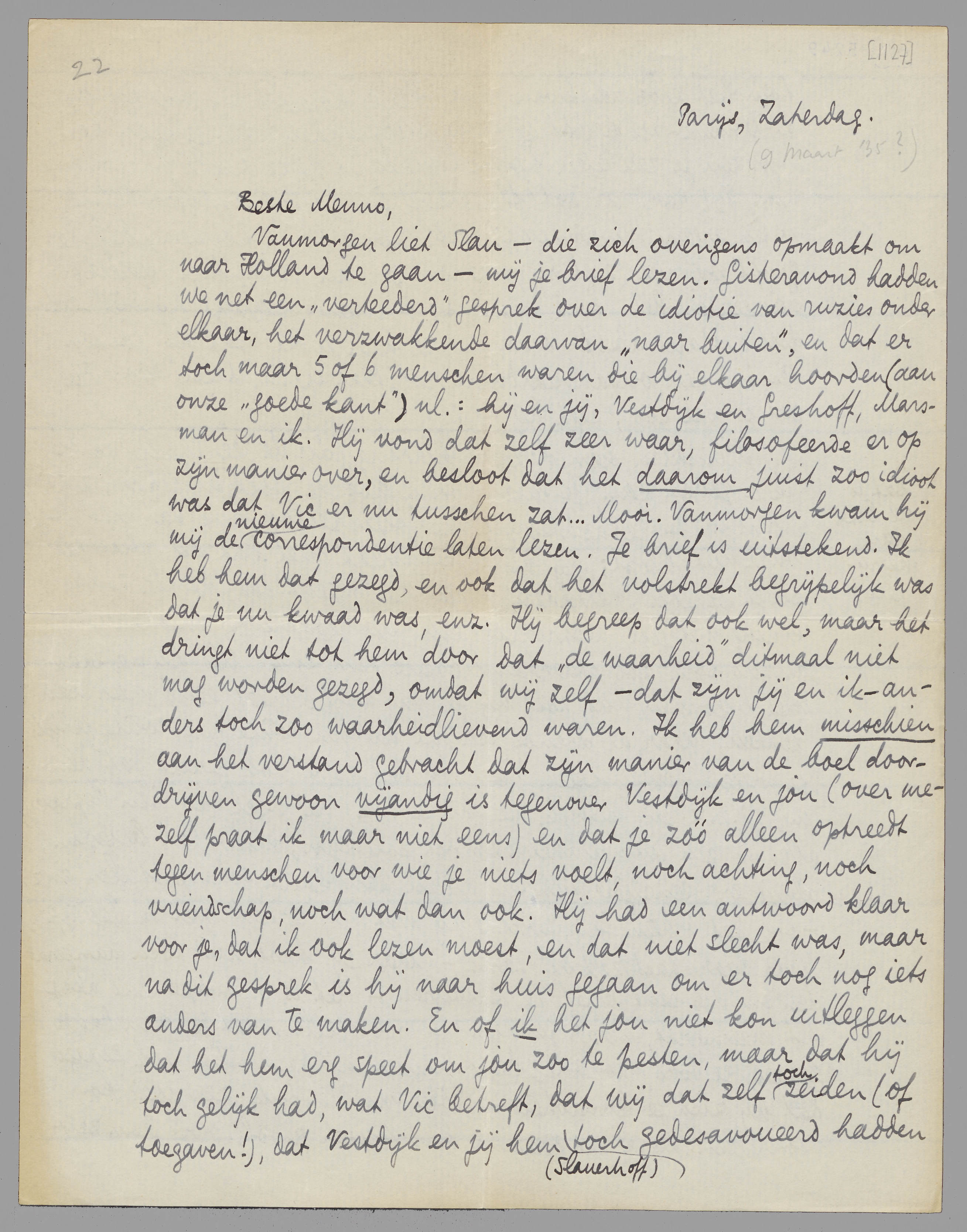 Schrijf me ook weer eens over andere dingen. Vestdijk kan dezen brief gerust lezen; Vic liever niet, omdat ik, hoe dan ook, toch niet graag den schijn zou wekken van partij voor hem te kiezen tegen Slau. Ik vind deze heele historie idioot, en kan me vooral goed voorstellen dat jij en Vestdijk er de pest over hebben, maar voor de heele houding van Vic heb ik alleen een ‘ver begrijpen’.