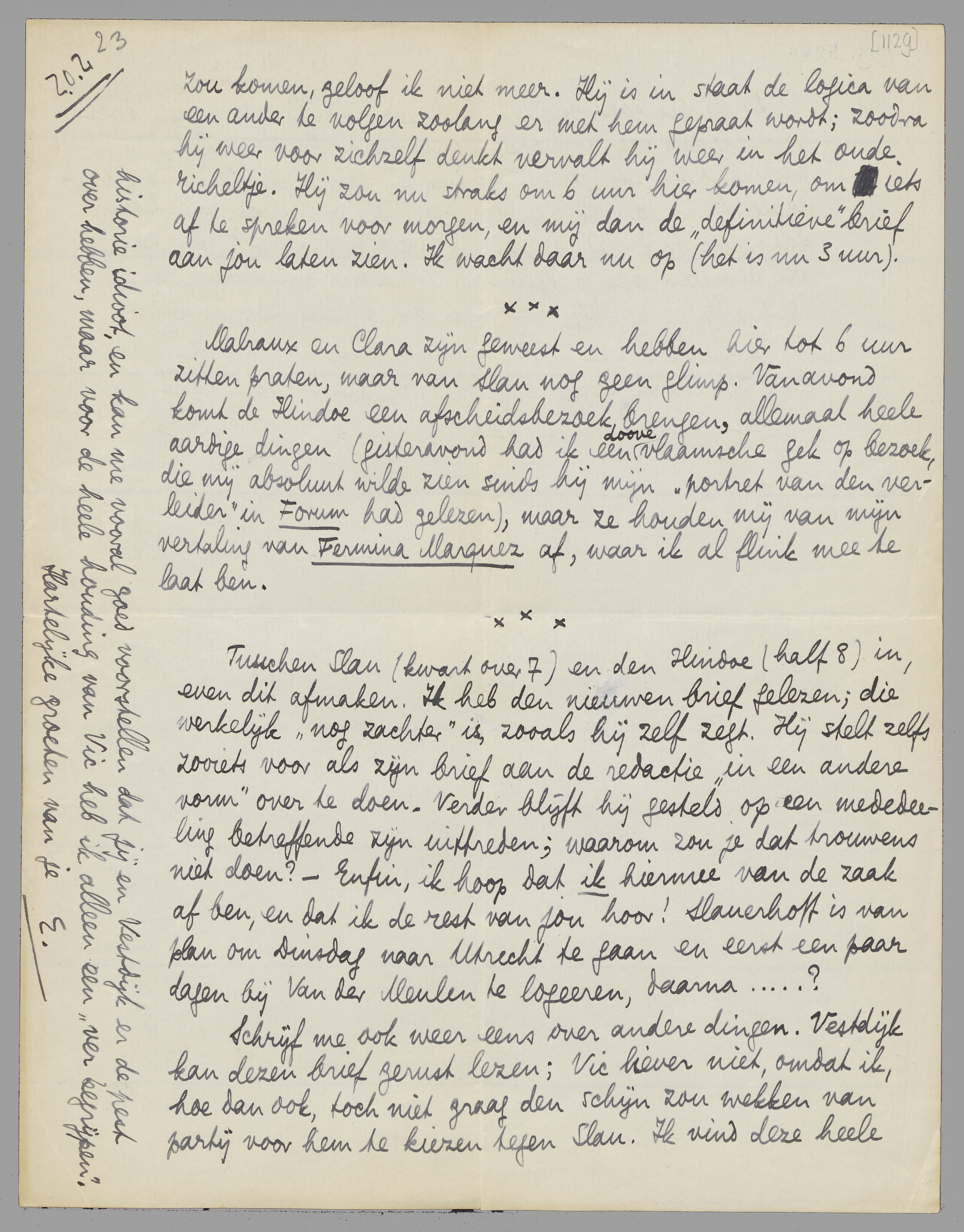 Malraux en Clara zijn geweest en hebben hier tot 6 uur zitten praten, maar van Slau nog geen glimp. Vanavond komt de Hindoe een afscheidsbezoek brengen, allemaal heele aardige dingen (gisteravond had ik een doove vlaamsche gek op bezoek, die mij absoluut wilde zien sinds hij mijn ‘portret van den verleider’ in Forum had gelezen), maar ze houden mij van mijn vertaling van Fermina Marquez af, waar ik al flink mee te laat ben.