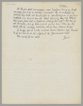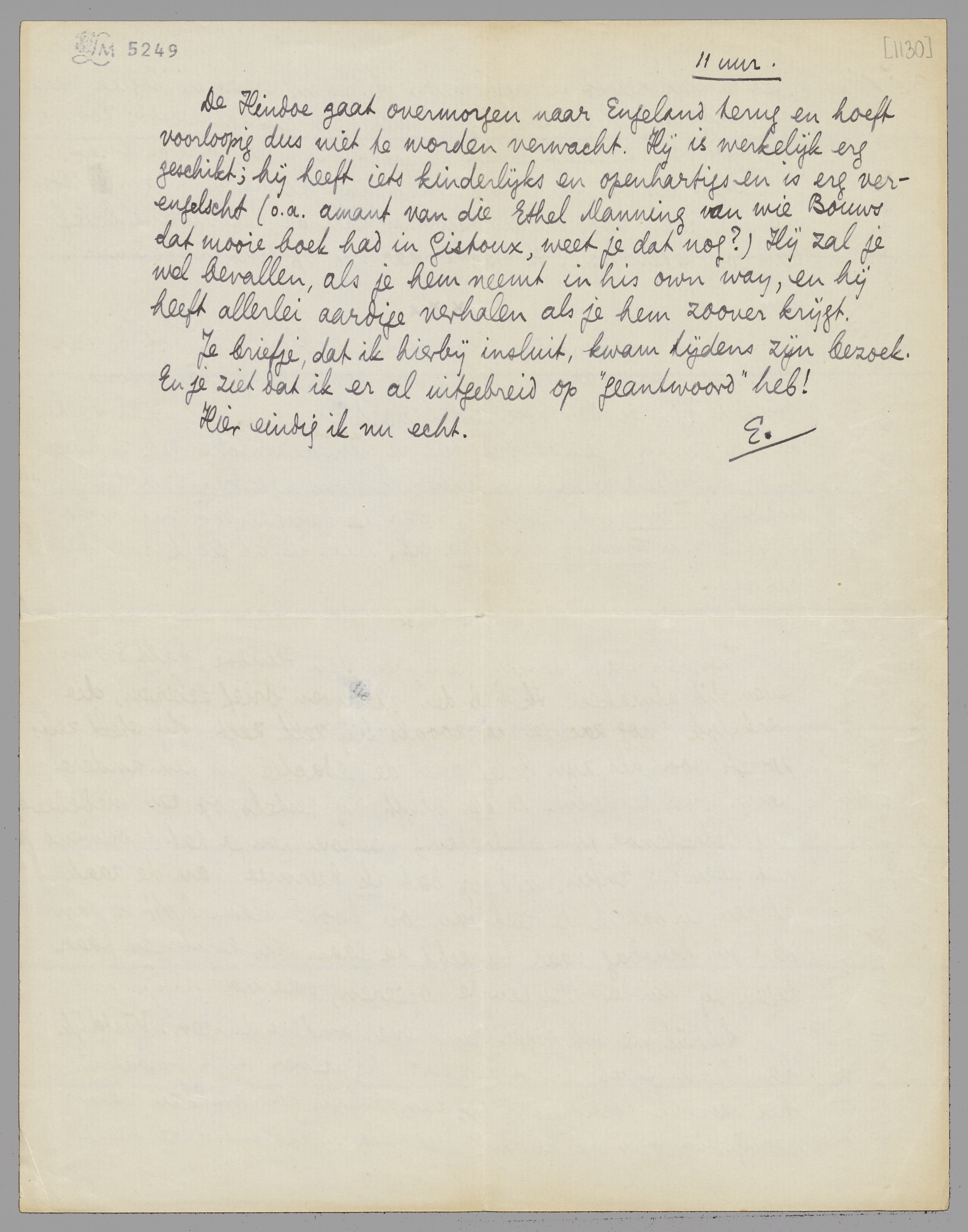De Hindoe gaat overmorgen naar Engeland terug en hoeft voorloopig dus niet te worden verwacht. Hij is werkelijk erg geschikt; hij heeft iets kinderlijks en openhartigs en is erg verengelscht (o.a. amant van die Ethel Manning van wie Bouws dat mooie boek had in Gistoux, weet je dat nog?) Hij zal je wel bevallen, als je hem neemt in his own way, en hij heeft allerlei aardige verhalen als je hem zoover krijgt.