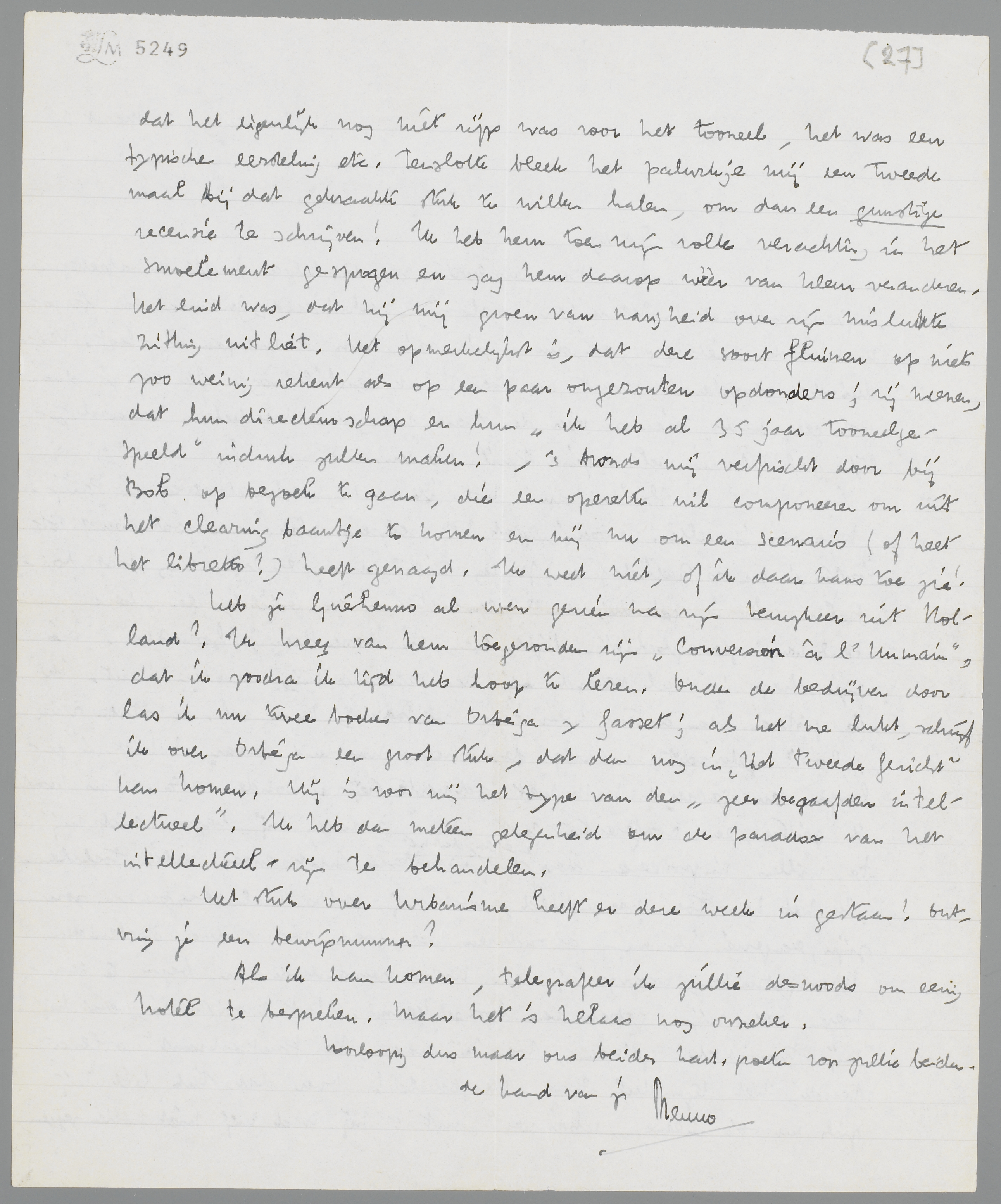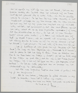 Heb je Guéhenno al weer gezien na zijn terugkeer uit Holland? Ik kreeg van hem toegezonden zijn Conversion à l' Humain, dat ik zoodra ik tijd heb hoop te lezen. Onder de bedrijven door las ik nu twee boeken van Ortéga Y Gasset; als het me lukt, schrijf ik over Ortéga een groot stuk, dat dan nog in Het Tweede Gezicht kan komen. Hij is voor mij het type van den ‘zeer begaafden intellectueel’. Ik heb dan meteen gelegenheid om de paradox van het intellectueel-zijn te behandelen.