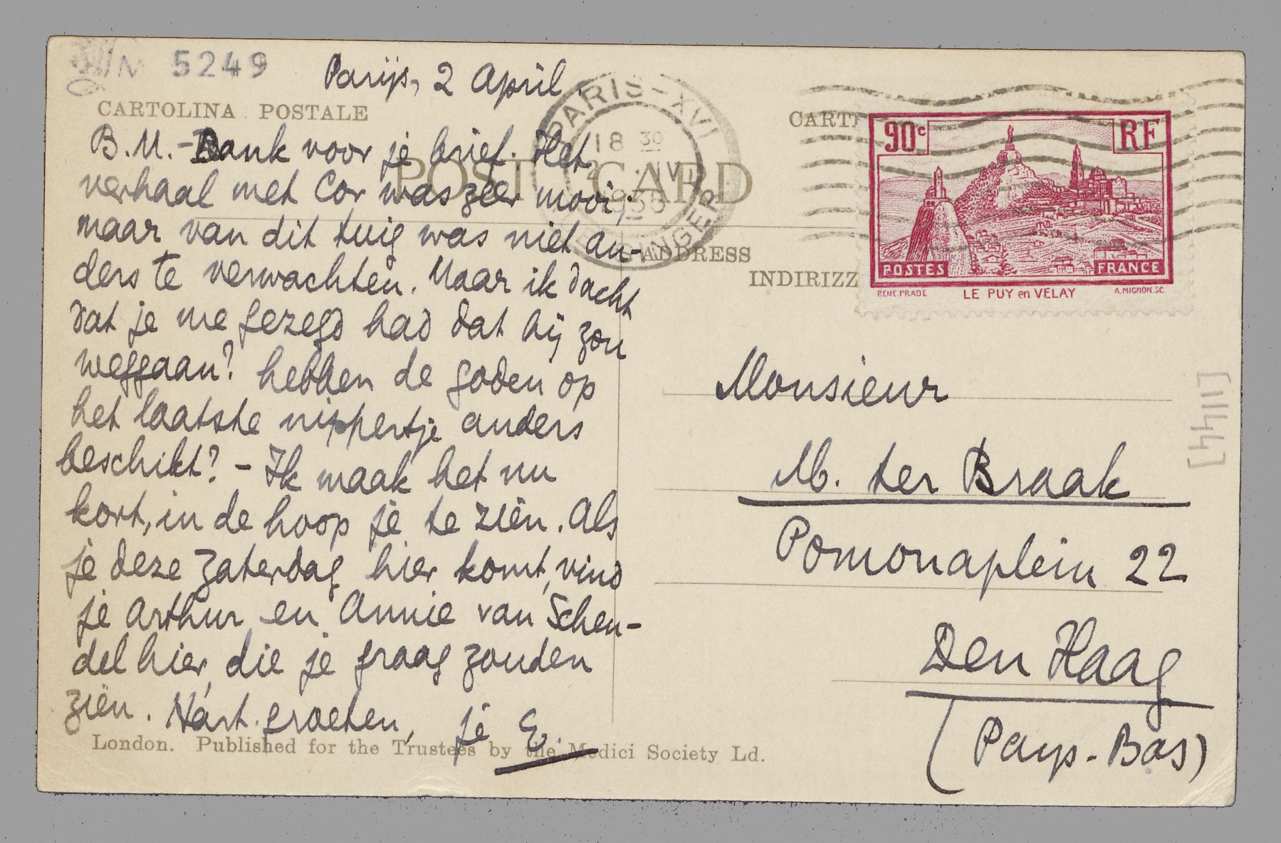 -Dank voor je brief. Het verhaal met Cor was zeer mooi, maar van dit tuig was niets anders te verwachten. Maar ik dacht dat je me gezegd had dat hij zou weggaan? hebben de Goden op het laatste nippertje anders beschikt? - Ik maak het nu kort, in de hoop je te zien. Als je deze Zaterdag hier komt, vind je Arthur en Annie van Schendel hier, die je graag zouden zien. Hart. groeten,