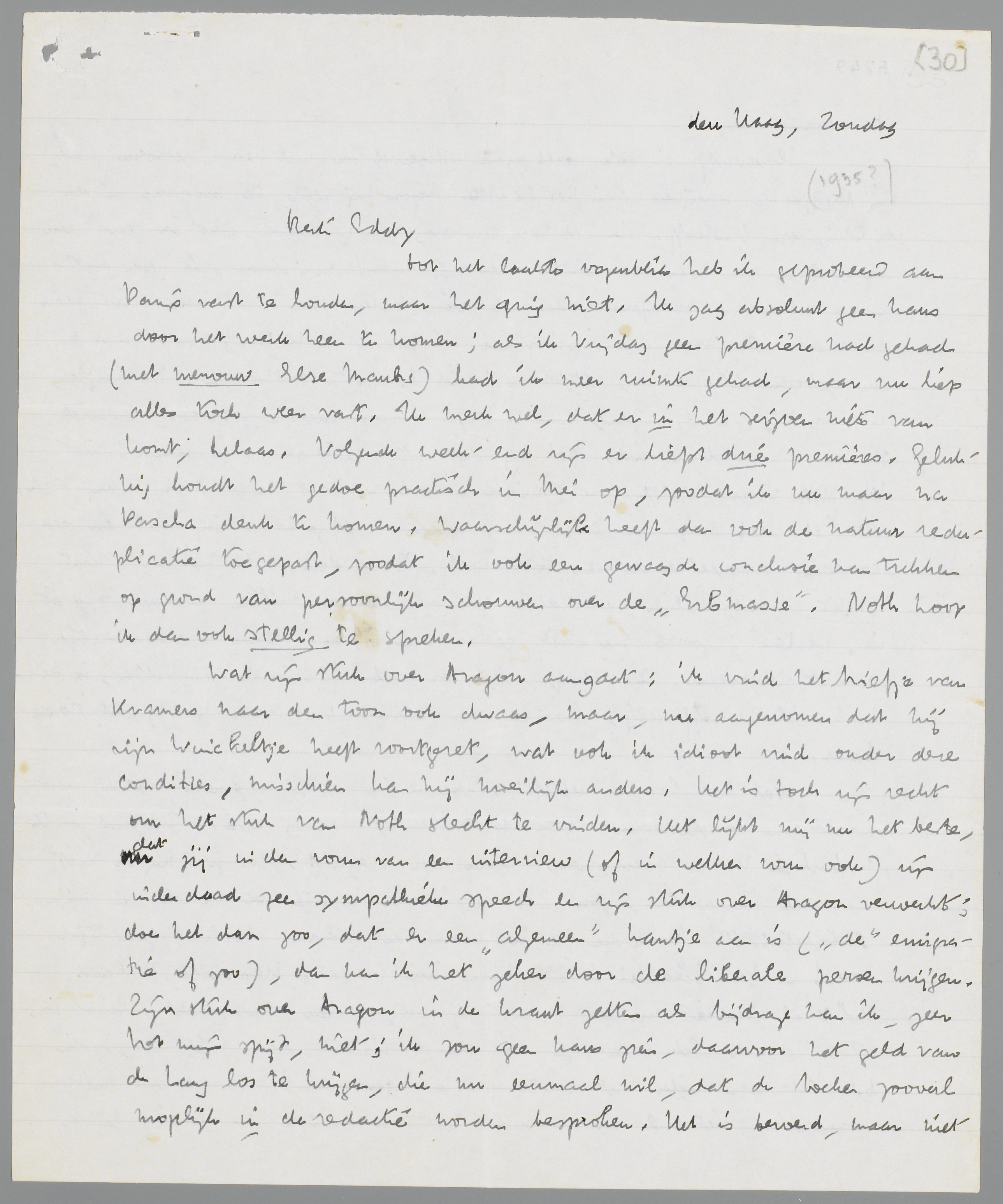 Wat zijn stuk over Aragon aangaat: Ik vind het briefje van Kramers naar den toon ook dwaas, maar, nu aangenomen dat hij zijn Winckeltje heeft voortgezet, wat ook ik idioot vind onder deze condities, misschien kan hij moeilijk anders. Het is toch zijn recht om het stuk van Noth slecht te vinden. Het lijkt mij nu het beste, dat jij in den vorm van een interview (of in welken vorm ook) zijn inderdaad zeer sympathieke speech en zijn stuk over Aragon verwerkt; doe het dan zoo, dat er een ‘algemeen’ kantje aan is (‘de’ emigratie of zoo), dan kan ik het zeker door de liberale persen krijgen. Zijn stuk over Aragon in de krant zetten als bijdrage kan ik, zeer tot mijn spijt, niet; ik zou geen kans zien, daarvoor het geld van de Lang los te krijgen, die nu eenmaal wil, dat de boeken zooveel mogelijk in de redactie worden besproken. Het is beroerd, maar niet te veranderen.
