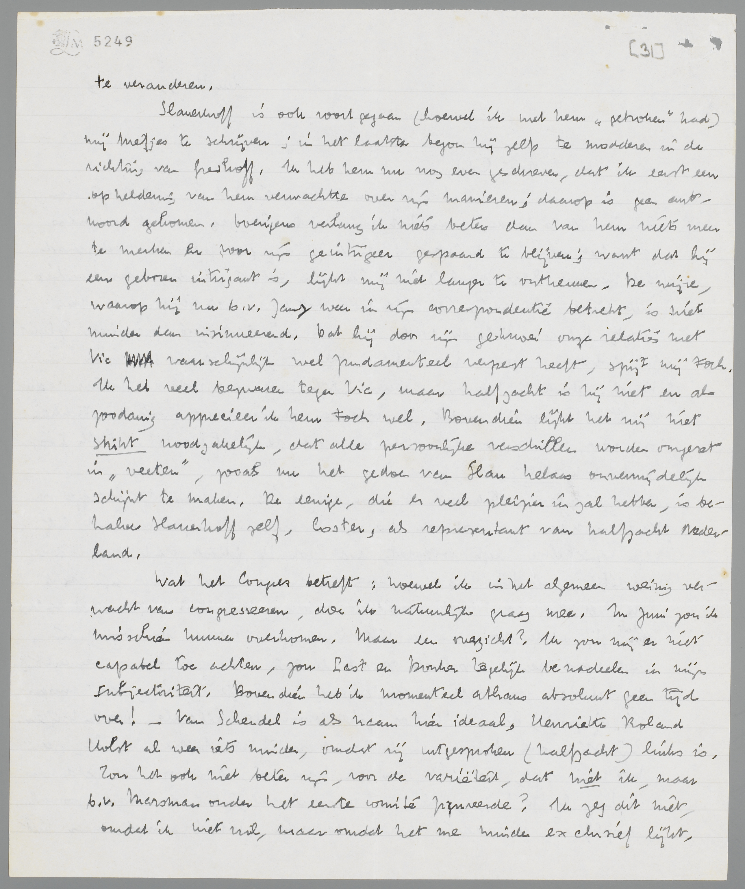 Slauerhoff is ook voortgegaan (hoewel ik met hem ‘gebroken’ had) mij briefjes te schrijven; in het laatste begon hij zelfs te modderen in de richting van Greshoff. Ik heb hem nu nog even geschreven, dat ik eerst een opheldering van hem verwachtte over zijn manieren; daarop is geen antwoord gekomen. Overigens verlang ik niets beters dan van hem niets meer te merken en voor zijn geïntrigeer gespaard te blijven; want dat hij een geboren intrigant is, lijkt mij niet langer te ontkennen. De wijze, waarop hij nu b.v. Jany weer in zijn correspondentie betrekt, is niet minder dan insinueerend. Dat hij door zijn geknoei onze relaties met Vic waarschijnlijk wel fundamenteel verpest heeft, spijt mij toch. Ik heb veel bezwaren tegen Vic, maar halfzacht is hij niet en als zoodanig apprecieer ik hem toch wel. Bovendien lijkt het mij niet strikt noodzakelijk, dat alle persoonlijke verschillen worden omgezet in ‘veeten’, zooals nu het gedoe van Slau helaas onvermijdelijk schijnt te maken. De eenige, die er veel pleizier in zal hebben, is behalve Slauerhoff zelf, Coster, als representant van halfzacht Nederland.