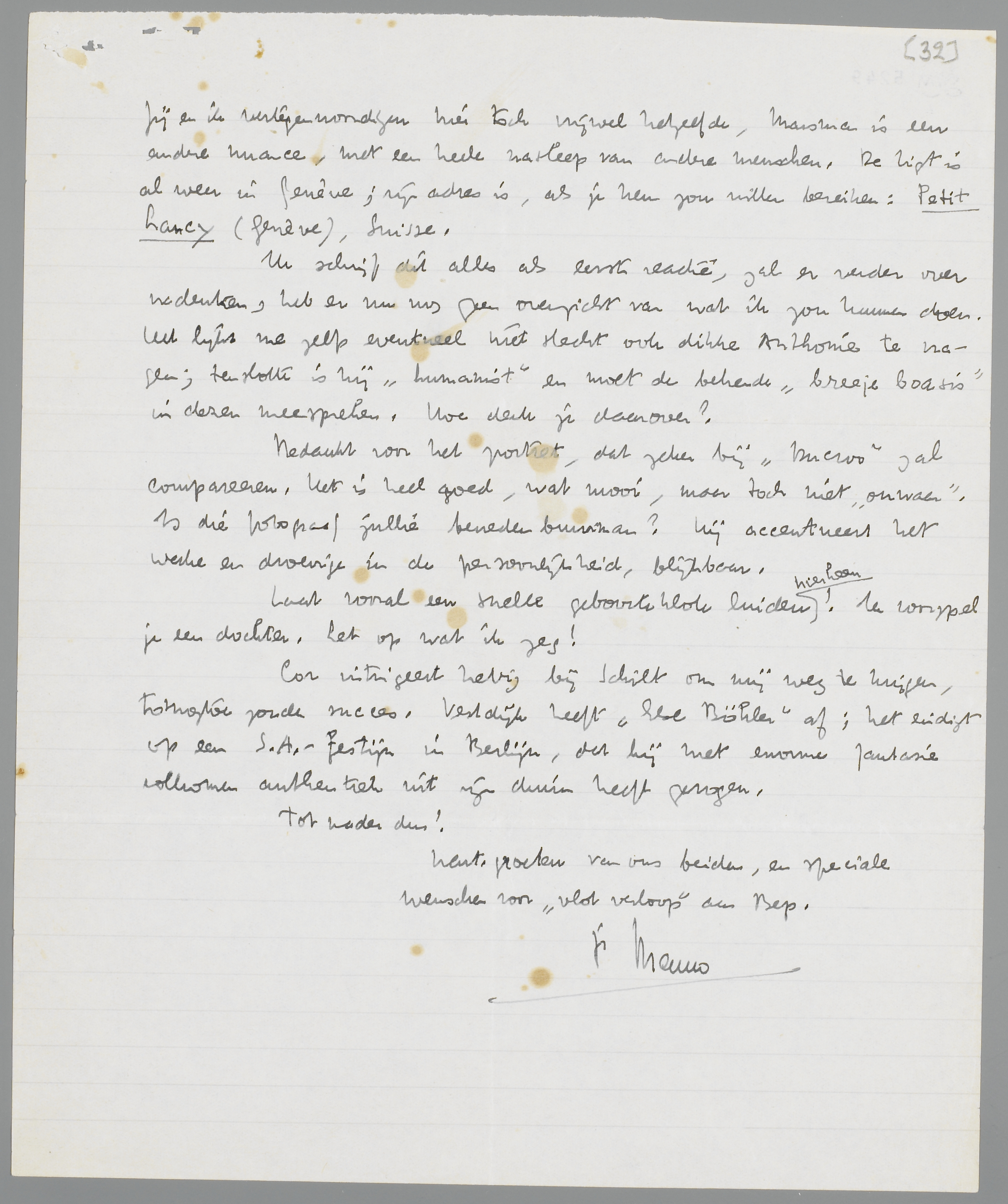 Wat het congres betreft: hoewel ik in het algemeen weinig verwacht van congresseeren, doe ik natuurlijk graag mee. In Juni zou ik misschien kunnen overkomen. Maar een overzicht? Ik zou mij er niet capabel toe achten, zou Last en Donker tegelijk benadeelen in mijn subjectiviteit. Bovendien heb ik momenteel althans absoluut geen tijd over! - Van Schendel is als naam hier ideaal, Henriette Roland Holst al weer iets minder, omdat zij uitgesproken (halfzacht) links is. Zou het ook niet beter zijn, voor de variëteit, dat niet ik, maar b.v. Marsman onder het eerste comité figureerde? Ik zeg dit niet, omdat ik niet wil, maar omdat het me minder exclusief lijkt, jij en ik vertegenwoordigen hier toch vrijwel hetzelfde. Marsman is een andere nuance, met een heele nasleep van andere menschen. De Ligt is al weer in Genève; zijn adres is, als je hem zou willen bereiken: Petit Lancy (Genève), Suisse.
