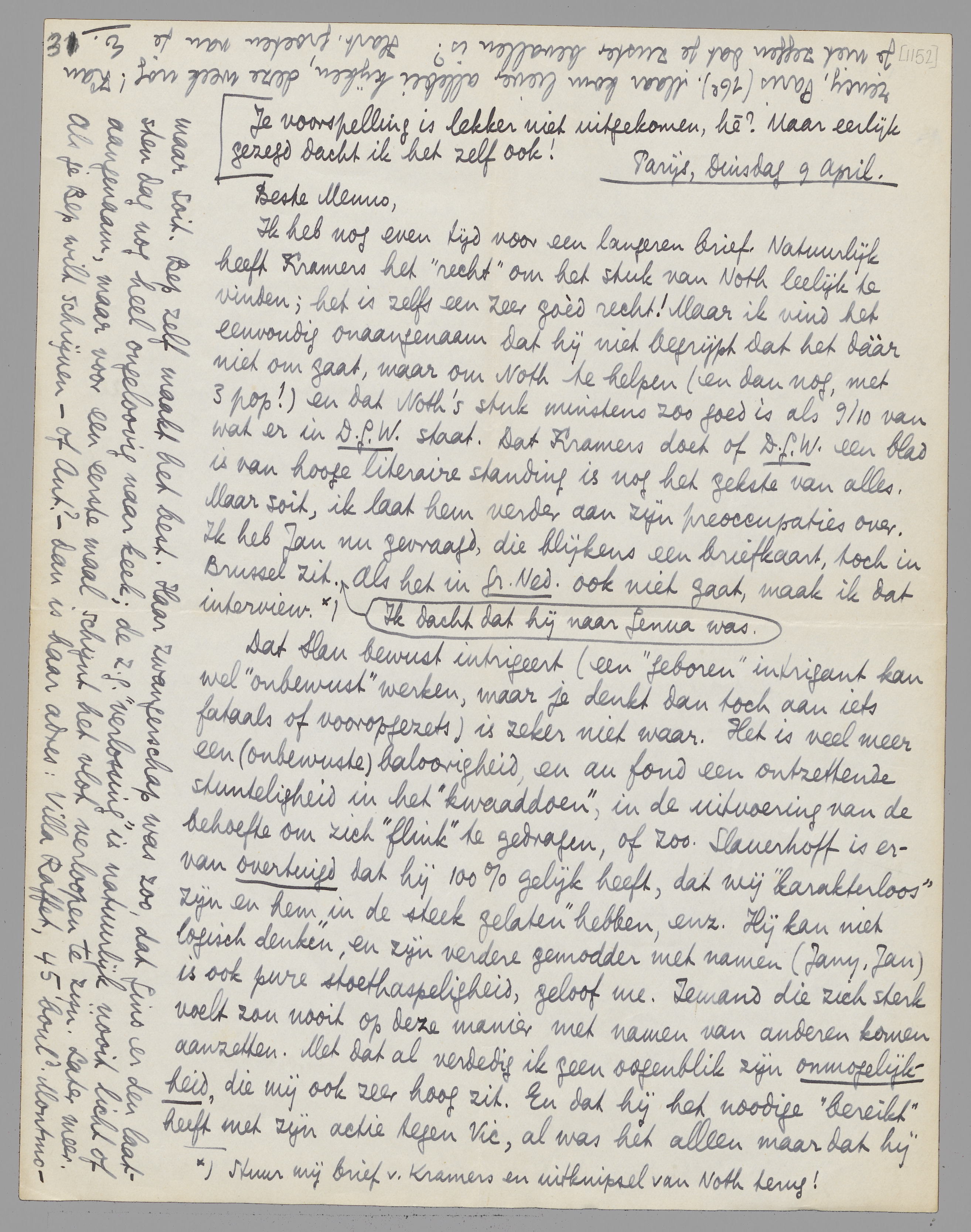 Ik heb nog even tijd voor een langeren brief. Natuurlijk heeft Kramers het ‘recht’ om het stuk van Noth leelijk te vinden; het is zelfs een zeer goèd recht! Maar ik vind het eenvoudig onaangenaam dat hij niet begrijpt dat het dààr niet om gaat, maar om Noth te helpen (en dan nog, met 3 pop!) en dat Noth's stuk minstens zoo goed is als 9/10 van wat er in D.G.W. staat. Dat Kramers doet of D.G.W. een blad is van hooge literaire standing is nog het gekste van alles. Maar soit, ik laat hem verder aan zijn preoccupaties over. Ik heb Jan nu gevraagd, die blijkens een briefkaart, toch in Brussel zit. Ik dacht dat hij naar Genua was. Als het in Gr. Ned. ook niet gaat, maak ik dat interview [Stuur mij brief van Kramers en uitknipsel van Noth terug!].
