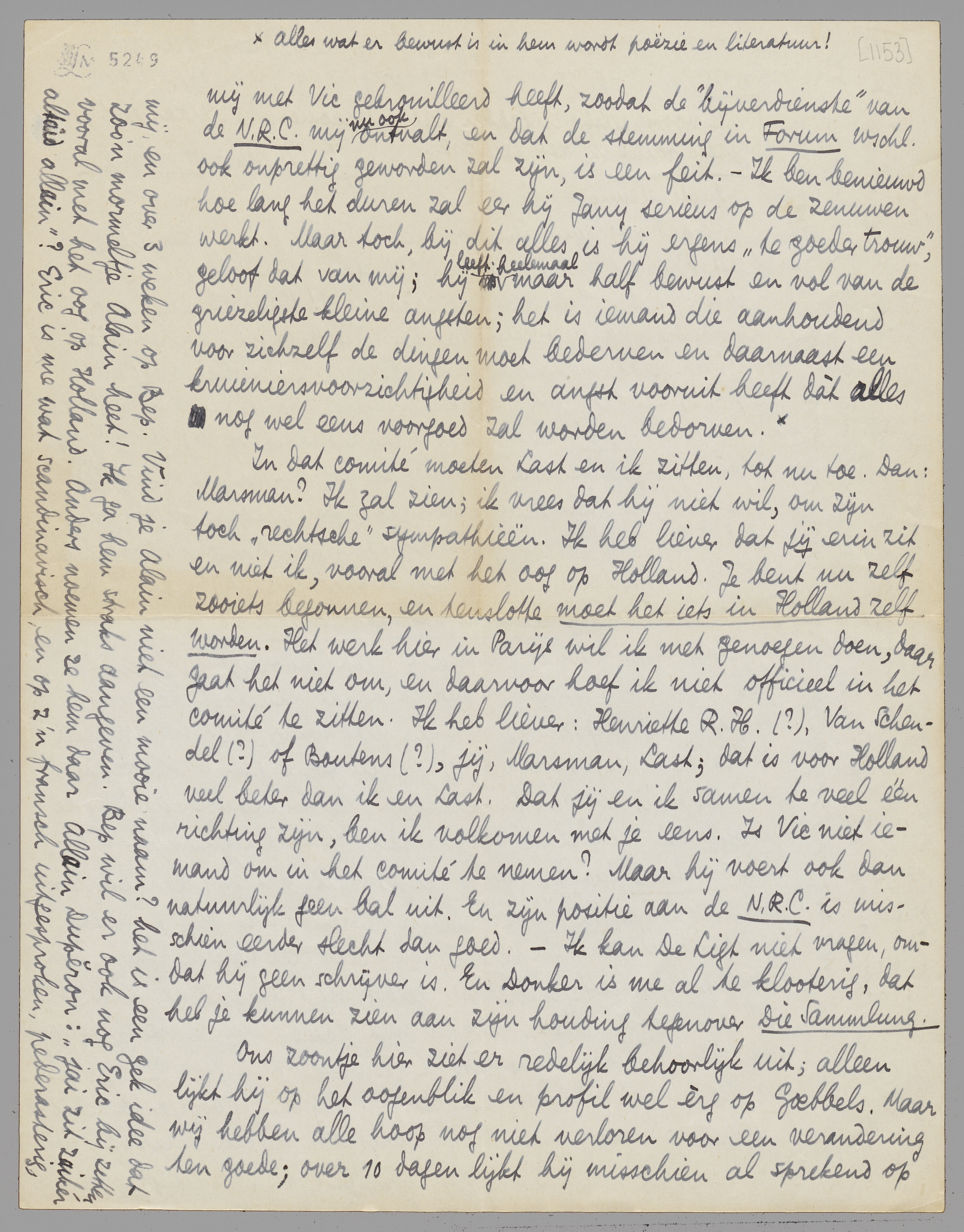 In dat comité moeten Last en ik zitten, tot nu toe. Dan: Marsman? Ik zal zien; ik vrees dat hij niet wil, om zijn toch ‘rechtsche’ sympathieën. Ik heb liever dat jij erin zit en niet ik, vooral met het oog op Holland. Je bent nu zelf zooiets begonnen, en tenslotte moet het iets in Holland zelf worden. Het werk hier in Parijs wil ik met genoegen doen, daar gaat het niet om, en daarvoor hoef ik niet officieel in het comité te zitten. Ik heb liever: Henriette R.H. (?), Van Schendel (?) of Boutens (?), jij, Marsman, Last; dat is voor Holland veel beter dan ik en Last. Dat jij en ik samen te veel één richting zijn, ben ik volkomen met je eens. Is Vic niet iemand om in het comité te nemen? Maar hij voert ook dan natuurlijk geen bal uit. En zijn positie aan de N.R.C. is misschien eerder slecht dan goed. - Ik kan De Ligt niet vragen, omdat hij geen schrijver is. En Donker is me al te klooterig, dat heb je kunnen zien aan zijn houding tegenover Die Sammlung.