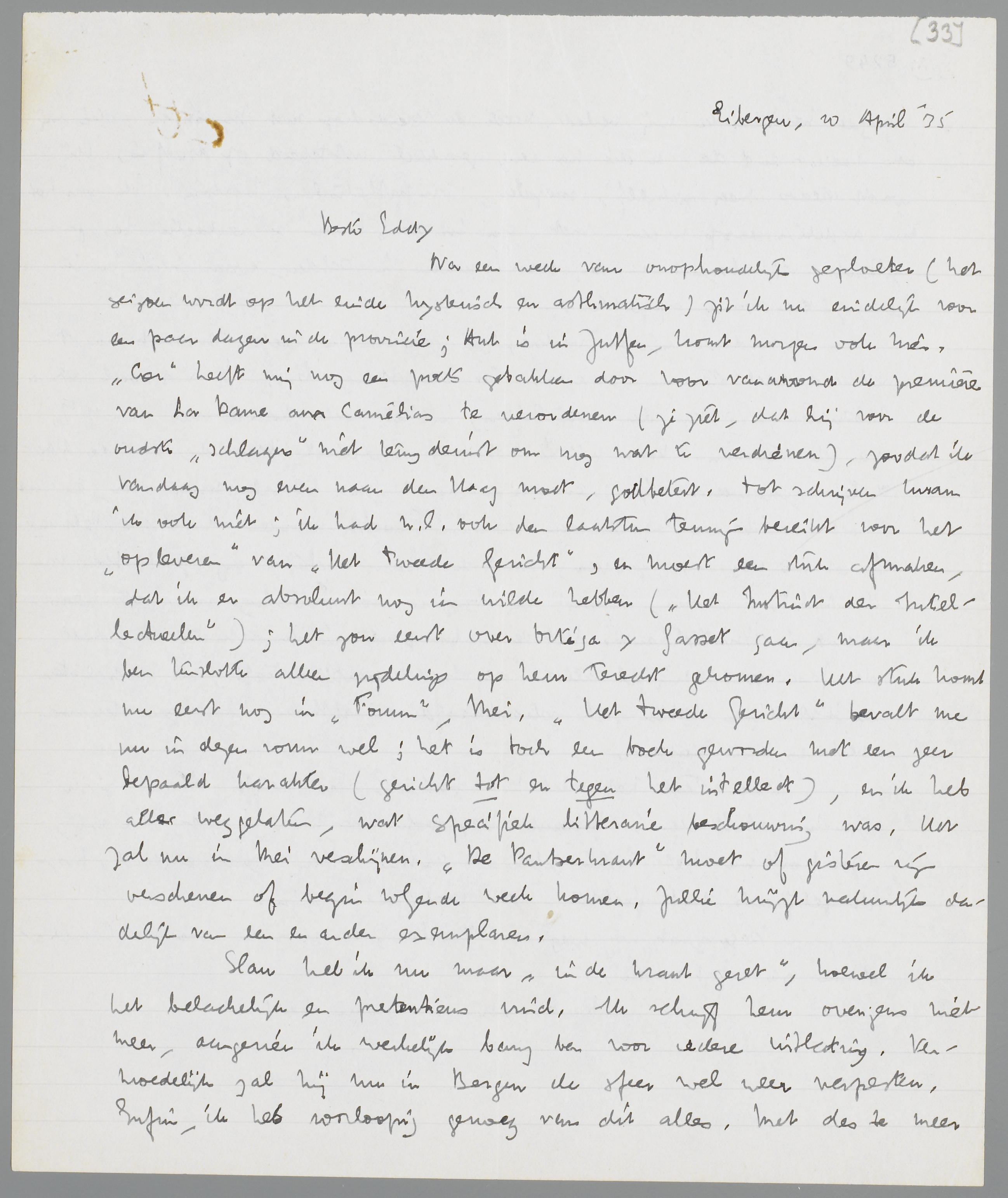 Na een week van onophoudelijk geploeter (het seizoen wordt op het einde hysterisch en asthmatisch) zit ik nu eindelijk voor een paar dagen in de provincie; Ant is in Zutfen, komt morgen ook hier. ‘Cor’ heeft mij nog een poets gebakken door voor vanavond de première van La Dame aux Camelias te verordenen (je ziet, dat hij voor de oudste ‘schlagers’ niet terugdeinst om nog wat te verdienen), zoodat ik vandaag nog even naar den Haag moet, godbetert. Tot schrijven kwam ik ook niet; ik had n.l. ook den laatsten termijn bereikt voor het ‘opleveren’ van Het Tweede Gezicht, en moest een stuk afmaken, dat ik er absoluut nog in wilde hebben (Het Instinct der Intellectueelen); het zou eerst over Ortéga y Gasset gaan, maar ik ben tenslotte alleen zijdelings op hem terecht gekomen. Het stuk komt nu eerst nog in Forum, Mei. Het Tweede Gezicht bevalt me nu in dezen vorm wel; het is toch een boek geworden met een zeer bepaald karakter (gericht tot en tegen het intellect), en ik heb alles weggelaten, wat specifiek litteraire beschouwing was. Het zal nu in Mei verschijnen. De Pantserkrant moet of gisteren zijn verschenen of begin volgende week komen. Jullie krijgt natuurlijk dadelijk van een en ander exemplaren.