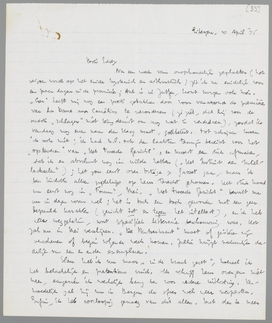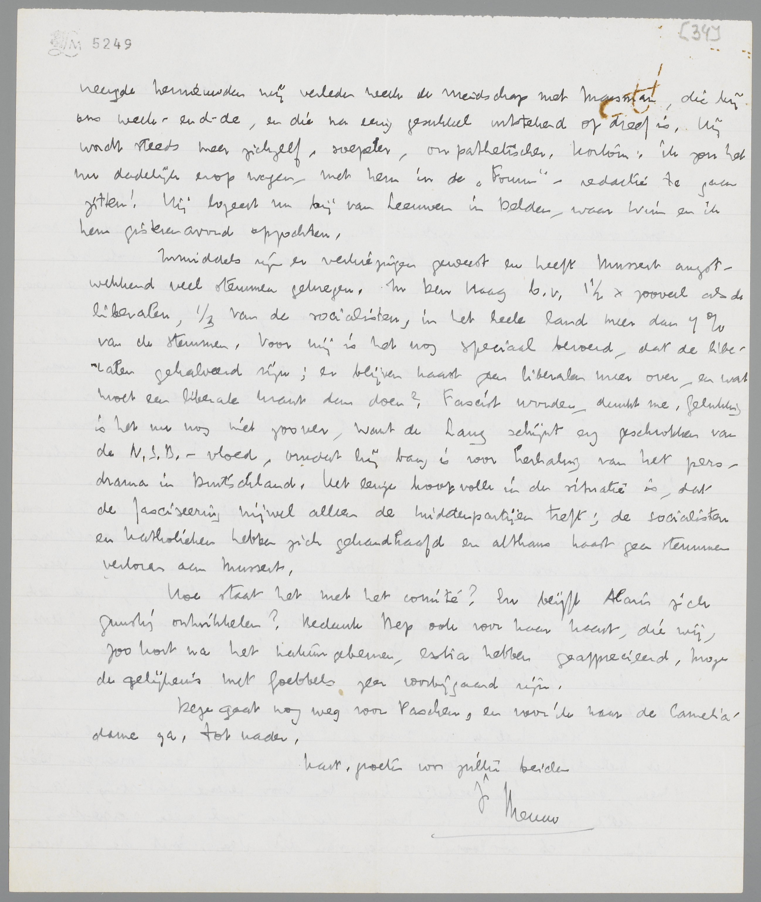 Inmiddels zijn er verkiezingen geweest en heeft Mussert angstwekkend veel stemmen gekregen. In Den Haag b.v. 1½ × zooveel als de liberalen, 1/3 van de socialisten, in het heele land meer dan 7% van de stemmen. Voor mij is het nog speciaal beroerd, dat de liberalen gehalveerd zijn; er blijven haast geen liberalen meer over, en wat moet een liberale krant dan doen? Fascist worden, dunkt me. Gelukkig is het nu nog niet zoover, want de Lang schijnt erg geschrokken van de N.S.B.-vloed, omdat hij bang is voor herhaling van het persdrama in Duitschland. Het eenige hoopvolle in de situatie is, dat de fasciseering vrijwel alleen de middenpartijen treft; de socialisten en katholieken hebben zich gehandhaafd en althans haast geen stemmen verloren aan Mussert.
