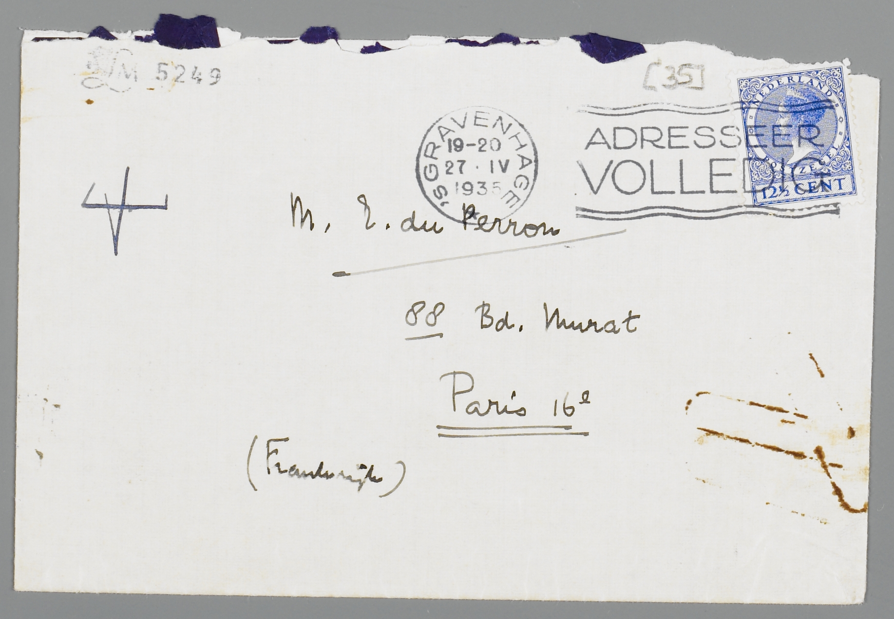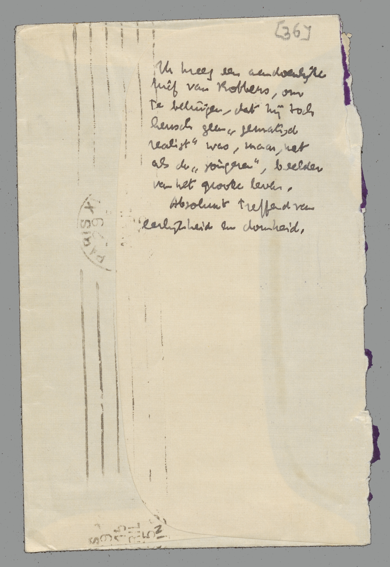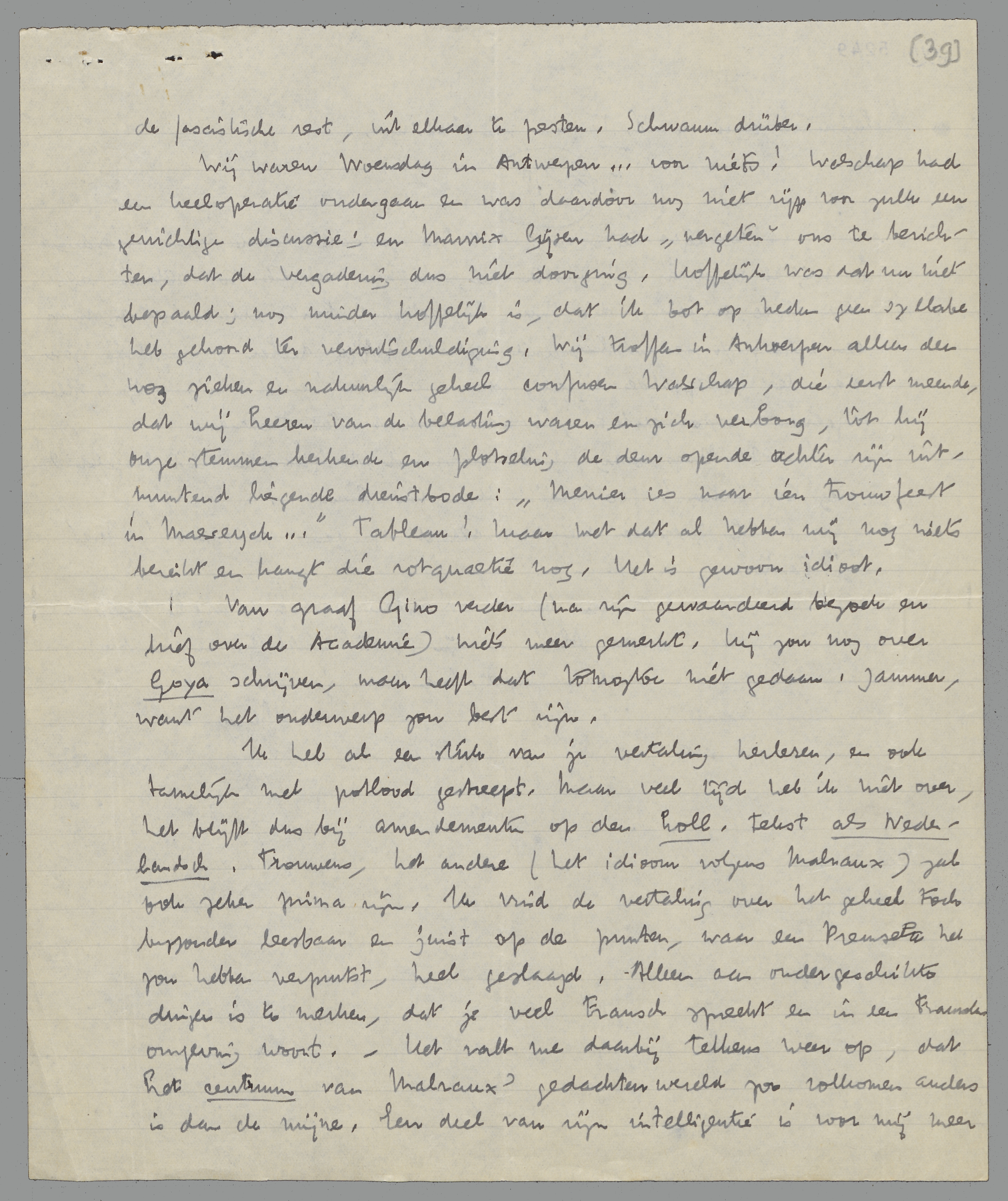 Ik heb al een stuk van je vertaling herlezen, en ook tamelijk met potlood gestreept. Maar veel tijd heb ik niet over, het blijft dus bij amendementen op den holl. tekst als Nederlandsch. Trouwens, het andere (het idioom volgens Malraux) zal ook zeker prima zijn. Ik vind de vertaling over het geheel toch bijzonder leesbaar en juist op de punten, waar een Premsela het zou hebben verprutst, heel geslaagd. Alleen aan ondergeschikte dingen is te merken, dat je veel Fransch spreekt en in een Fransche omgeving woont. Het valt me daarbij telkens weer op, dat het centrum van Malraux' gedachtenwereld zoo volkomen anders is dan de mijne. Een deel van zijn intelligentie is voor mij meer scholastiek dan de H. Thomas van Aquino.