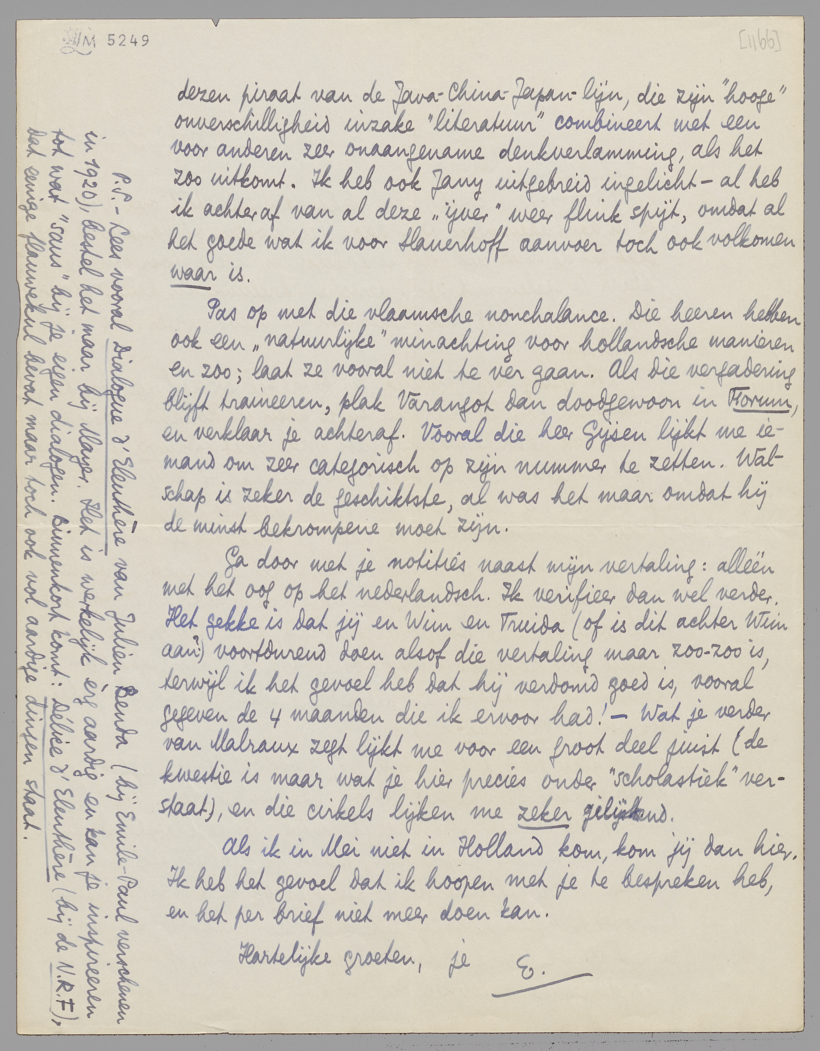 Ga door met je notities naast mijn vertaling: alléén met het oog op het nederlandsch. Ik verifieer dan wel verder. Het gekke is dat jij en Wim en Truida (of is dit achter Wim aan?) voortdurend doen alsof die vertaling maar zoo-zoo is, terwijl ik het gevoel heb dat hij verdomd goed is, vooral gegeven de 4 maanden die ik ervoor had! - Wat je verder van Malraux zegt lijkt me voor een groot deel juist (de kwestie is maar wat je hier precies onder ‘scholastiek’ verstaat), en die cirkels lijken me zeker gelijkend.