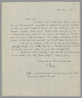 Een brief van jou kruiste mijn brief, waarop je dus nog niet antwoordde; inmiddels je briefkaart van Zondag, waarop je plan om naar Brussel te komen. Ik kom natuurlijk, als ik eenigszins weg kan, even bij je. Zonder nadere storingen kan ik Vrijdagmorgen weg, zoodat ik dan nog in den middag in Brussel zou kunnen zijn. Zaterdagmiddag is die beroemde vergadering in Antwerpen; ik kan dus heel geschikt van Brussel daar naar toe gaan.