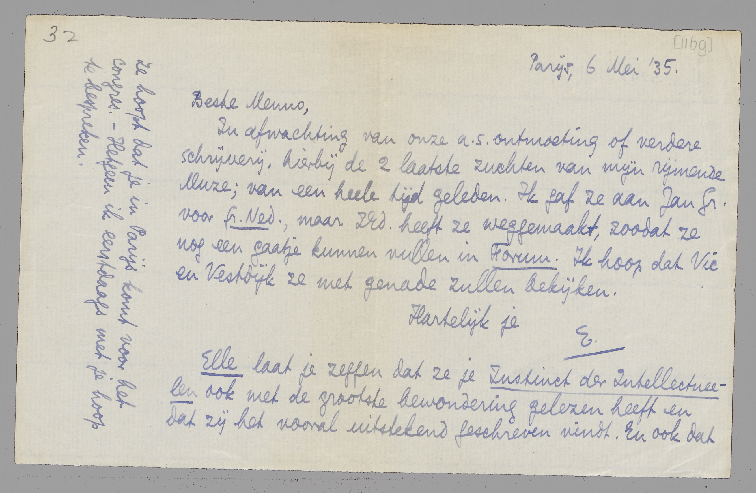 Elle laat je zeggen dat ze je Instinct der Intellectueelen ook met de grootste bewondering gelezen heeft en dat zij het vooral uitstekend geschreven vindt. En ook dat ze hoopt dat je in Parijs komt voor het congres. - Hetgeen ik eerstdaags met je hoop te bespreken.
