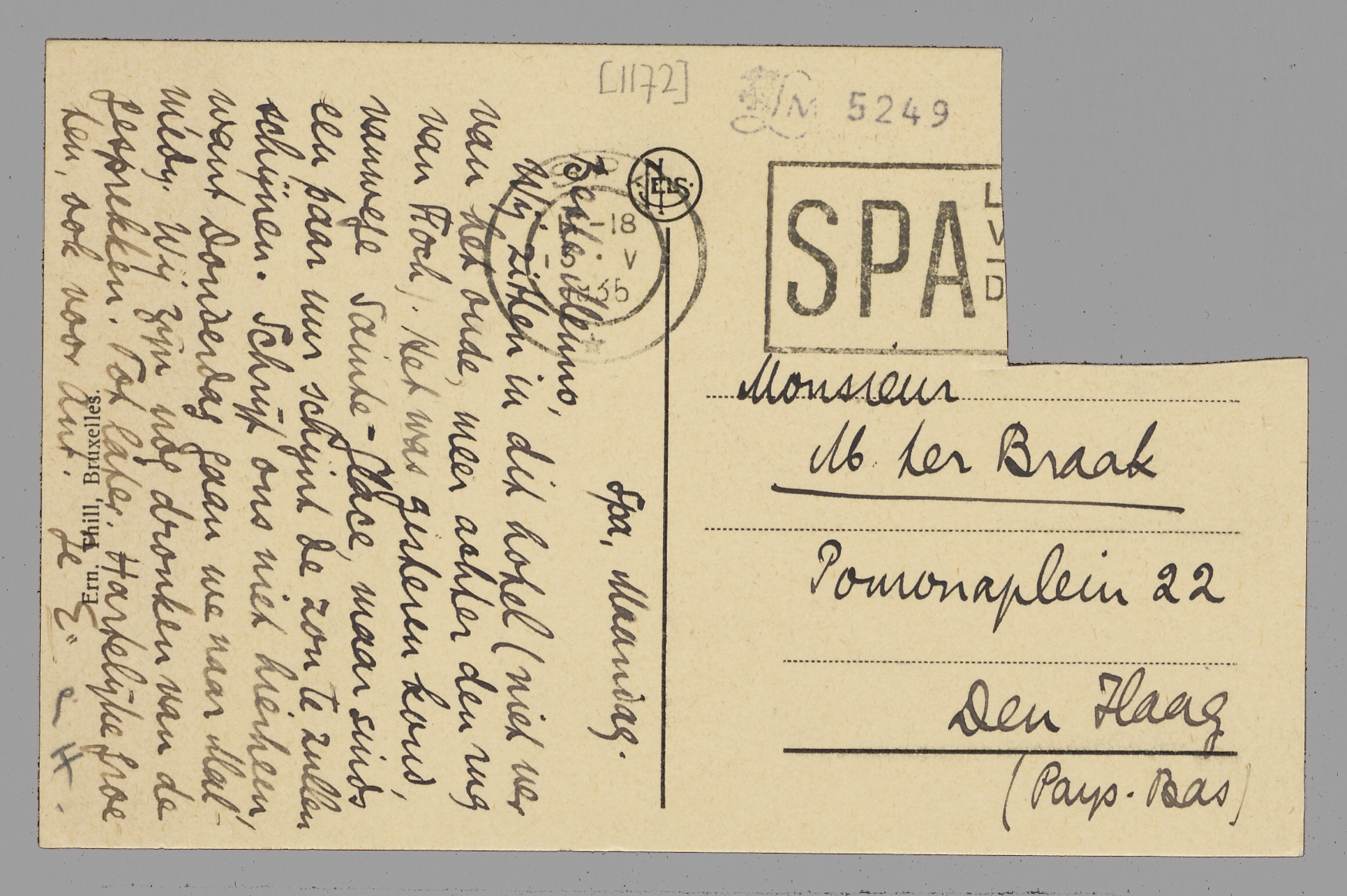 Wij zitten in dit hotel (niet ver van het oude, meer achter den rug van Foch). Het was gisteren koud vanwege Sainte-Glace, maar sinds een paar uur schijnt de zon te zullen schijnen. Schrijf ons niet hierheen, want Donderdag gaan we naar Malmédy. Wij zijn nog dronken van de gesprekken. Tot later. Hartelijke groeten, ook voor Ant.