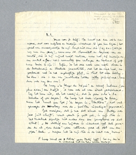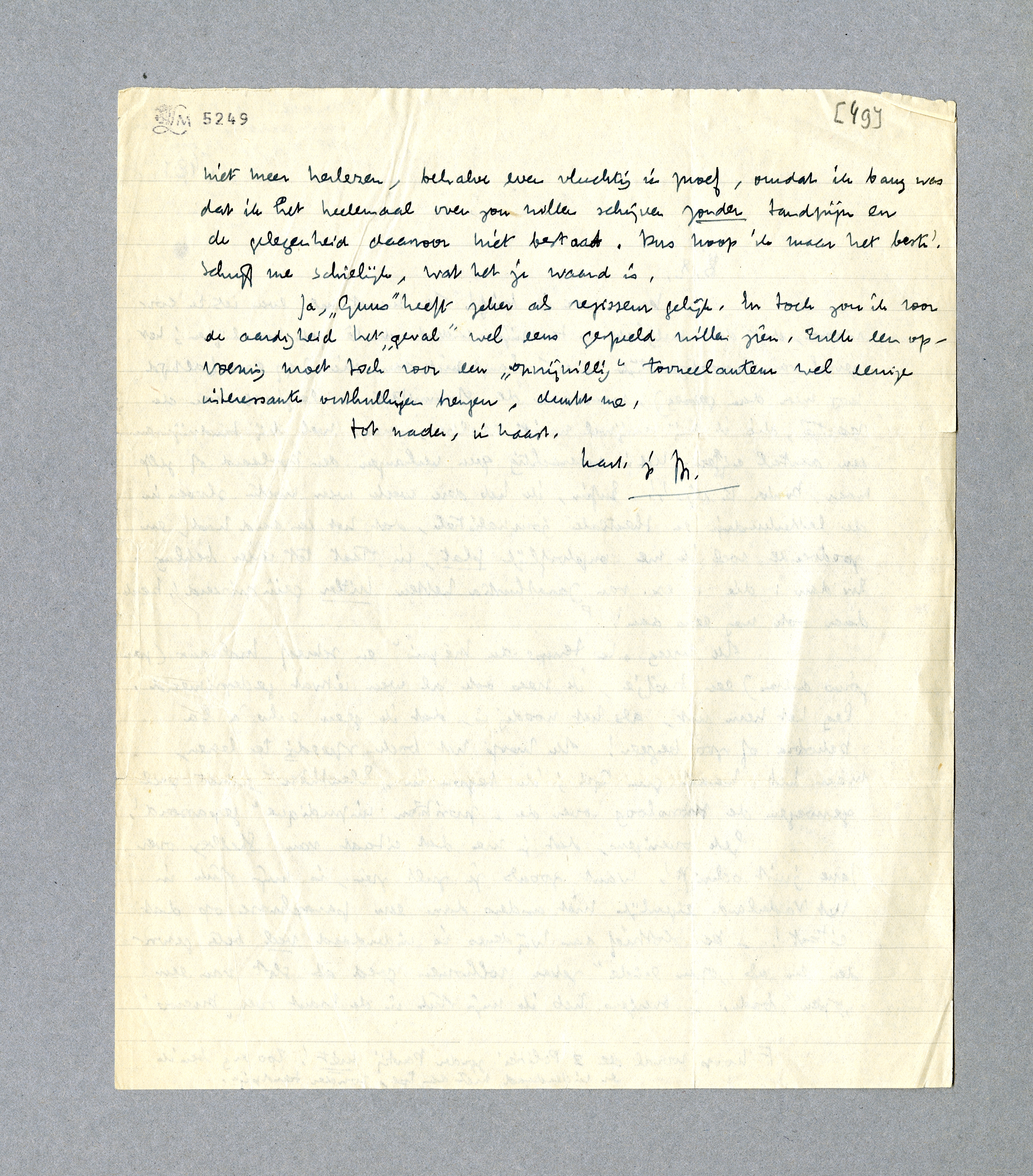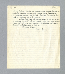 Dank voor je brief! Ik haast me even iets te corrigeeren, dat door meligheid en tandpijn inderdaad tè gek kon lijken; het gevoel van onnoodzakelijk te zijn hangt niet aan die 397 ex. (altijd nog meer dan genoeg), maar aan de stommiteit en leegheid van de reactie, die ik mij vrijwel nooit realiseer, maar wel bij tandpijn en een aantal cijfers. Het is waarachtig geen verlangen den Doolaard of zelfs maar Donker te zijn!! Enfin, ik heb deze week weer moeten sloven in de letterkundige en theatrale journalistiek, dat het een aard had, en zoodoende voel ik me ongelooflijk plat, in staat tot ieder beklag. En dan: die 11 ex. van Zarathustra hebben Hitler geïnspireerd! Denk daar ook eens aan! [Koop vooral de 3 Politici zonder Partij niet! Zoo erg ben ik er inderdaad niet aan toe, zonder tandpijn.]