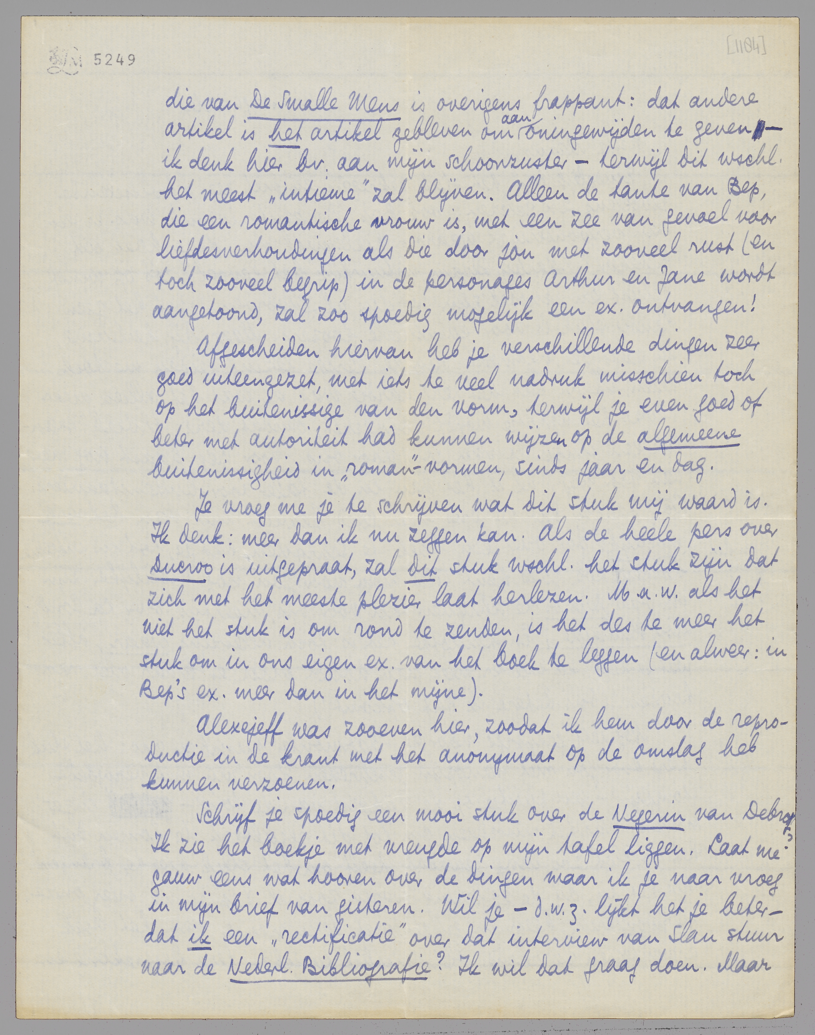 Je vroeg me je te schrijven wat dit stuk mij waard is. Ik denk: meer dan ik nu zeggen kan. Als de heele pers over Ducroo is uitgepraat, zal dit stuk wschl. het stuk zijn dat zich met het meeste plezier laat herlezen. M.a.w. als het niet het stuk is om rond te zenden, is het des te meer het stuk om in ons eigen ex. van het boek te leggen (en alweer: in Bep's ex. meer dan in het mijne). Alexejeff was zooeven hier, zoodat ik hem door de reproductie in de krant met het anonymaat op de omslag heb kunnen verzoenen.