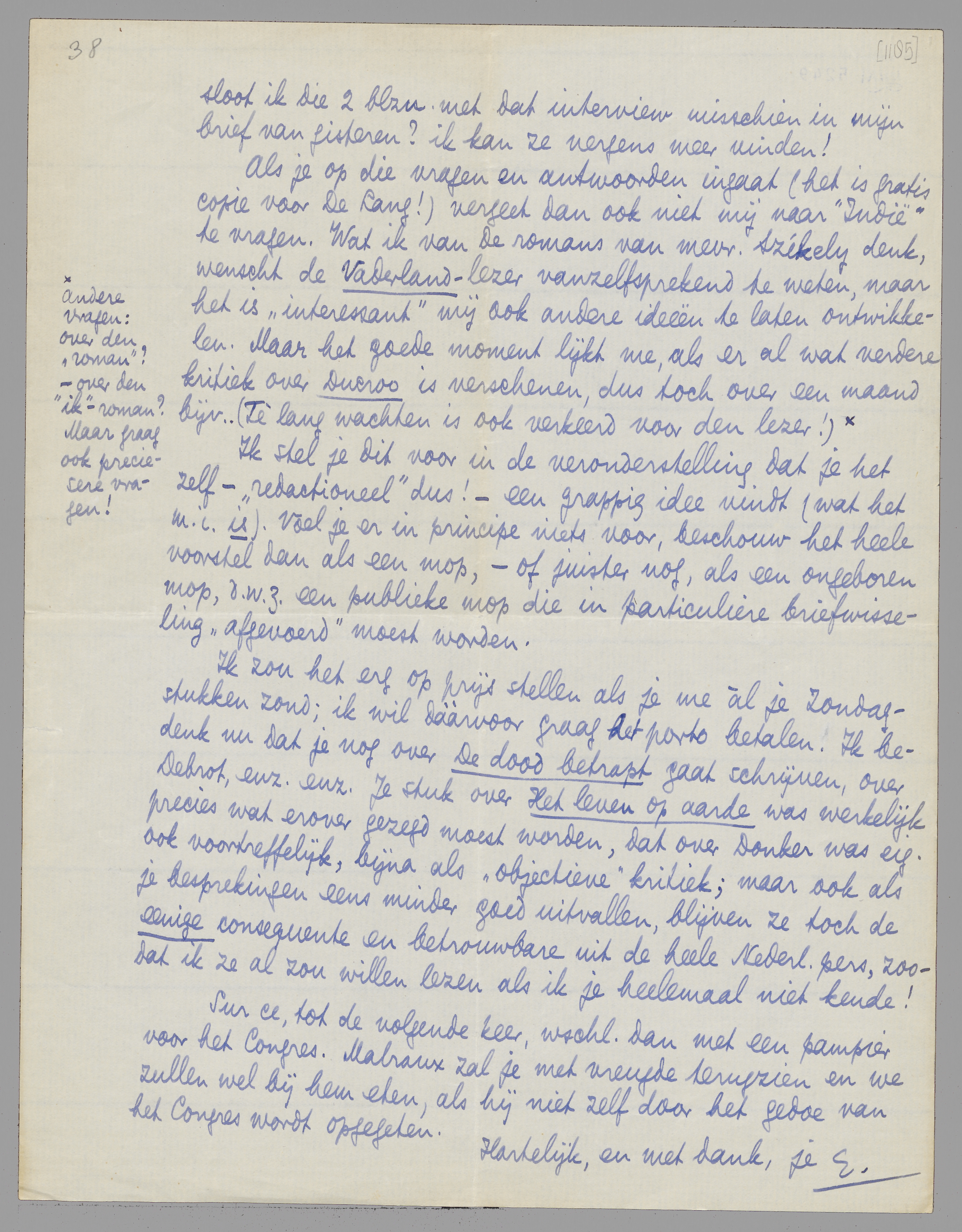 Als je op die vragen en antwoorden ingaat (het is gratis copie voor De Lang!) vergeet dan ook niet mij naar ‘Indië’ te vragen. Wat ik van de romans van Mevr. Székely denk, wenscht de Vaderland-lezer vanzelfsprekend te weten, maar het is ‘interessant’ mij ook andere ideeën te laten ontwikkelen. Maar het goede moment lijkt me, als er al wat verdere kritiek over Ducroo is verschenen, dus toch over een maand bijv. (Te lang wachten is ook verkeerd voor den lezer!) [andere vragen: over den ‘roman’? - over den ‘ik’-roman? Maar graag ook preciesere vragen!]