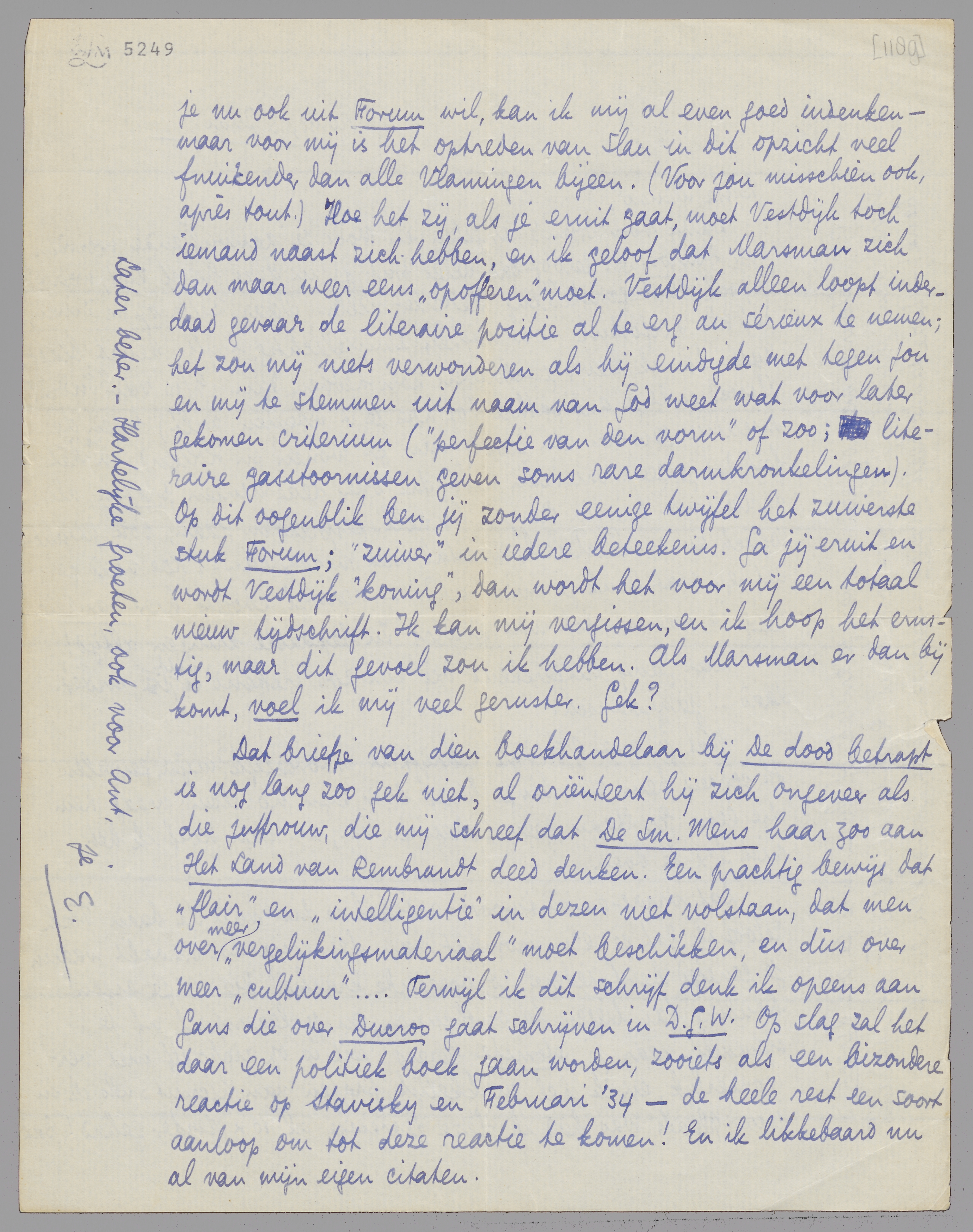 Dat vraag-en-antwoord-artikel is dus van de baan. Toch geloof ik dat je een moment van depressie doormaakt, waarin je geneigd bent iedere ‘opvoedende kracht’, die in je eigen houding kan liggen, te ontkennen, en je lezerspeil af te stemmen naar je stomste lezers. Dit is op zichzelf niet verwonderlijk, en ik heb makkelijk praten van hieruit: als ik in jouw plaats was, had ik deze depressie al 10 × eerder gehad! Dat je nu ook uit Forum wil, kan ik mij al even goed indenken - maar voor mij is het optreden van Slau in dit opzicht veel fnuikender dan alle Vlamingen bijeen. (Voor jou misschien ook, après tout.) Hoe het zij, als je eruit gaat, moet Vestdijk toch iemand naast zich hebben, en ik geloof dat Marsman zich dan maar weer eens ‘opofferen’ moet. Vestdijk alleen loopt inderdaad gevaar de literaire positie al te erg au sérieux te nemen; het zou mij niets verwonderen als hij eindigde met tegen jou en mij te stemmen uit naam van God weet wat voor later gekomen criterium (‘perfectie van den vorm’ of zoo; literaire gasstoornissen geven soms rare darmkronkelingen). Op dit oogenblik ben jij zonder eenige twijfel het zuiverste stuk Forum; ‘zuiver’ in iedere beteekenis. Ga jij eruit en wordt Vestdijk ‘koning’, dan wordt het voor mij een totaal nieuw tijdschrift. Ik kan mij vergissen, en ik hoop het ernstig, maar dit gevoel zou ik hebben. Als Marsman er dan bij komt, voel ik mij veel geruster. Gek?
