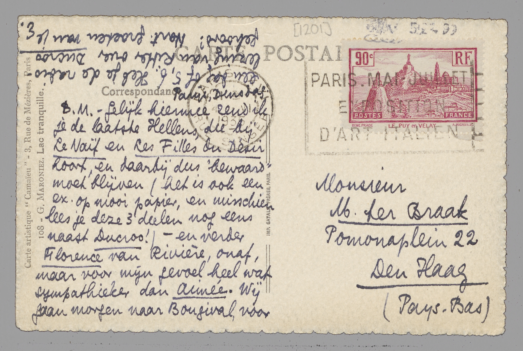 - Gelijk hiermee zend ik je de laatste Hellens, die bij Le Naïf en Les Filles du Desir hoort, en daarbij dus ‘bewaard’ moeten blijven (het is ook een ex. op mooi papier, en misschien lees je deze 3 deelen nog eens naast Ducroo!) - en verder Florence van Rivière, onaf, maar voor mijn gevoel heel wat sympathieker dan Aimée. Wij gaan morgen naar Bougival, voor een dag of 5, 6. Heb je de radiolezing van Ritter over Ducroo gehoord? Hart. groeten van je