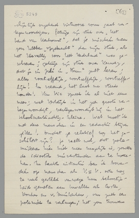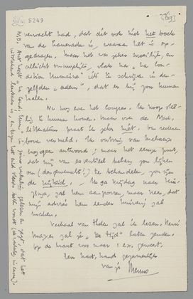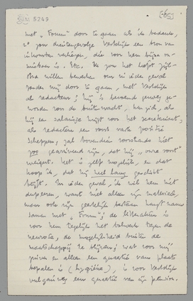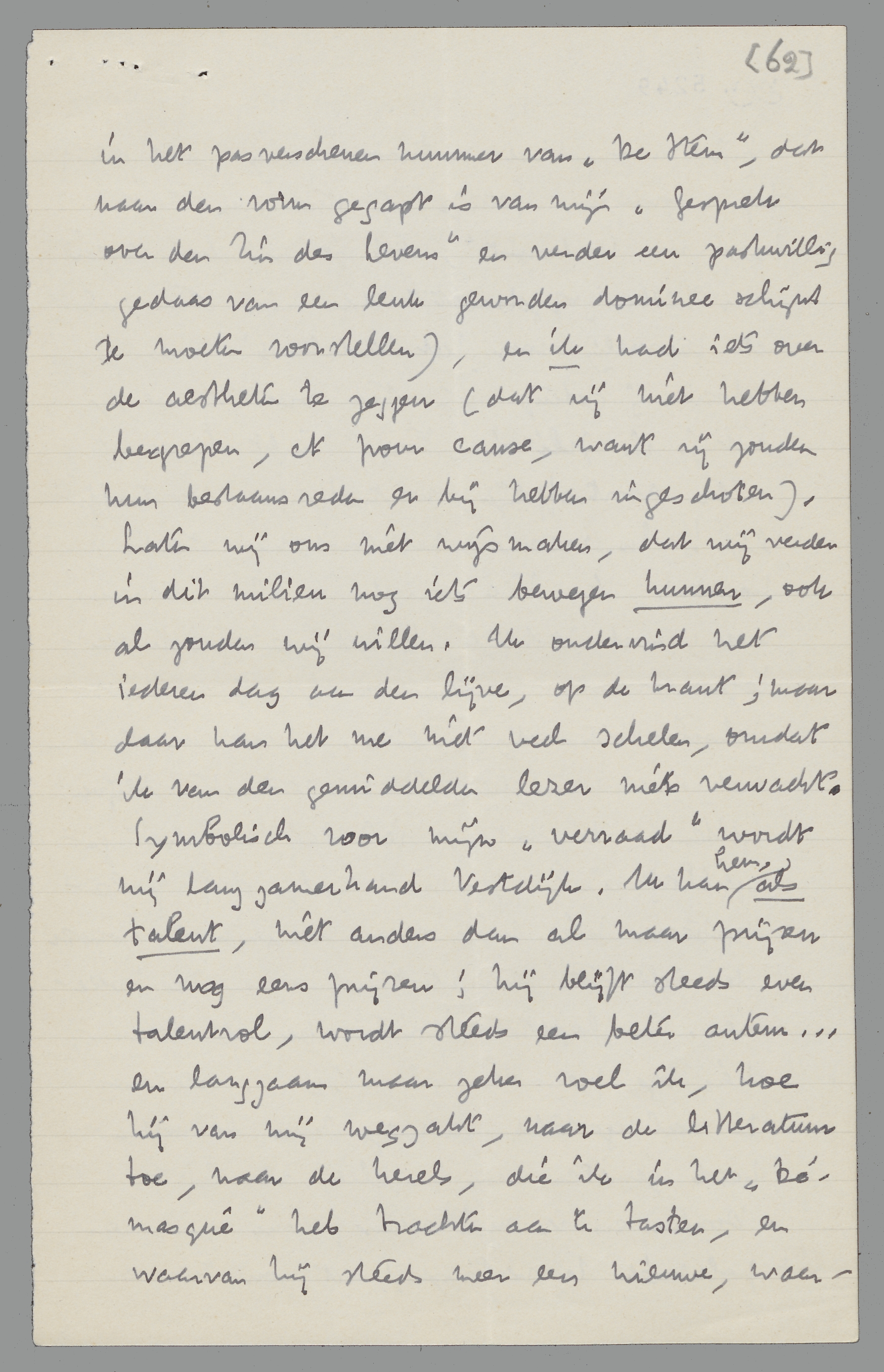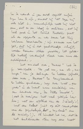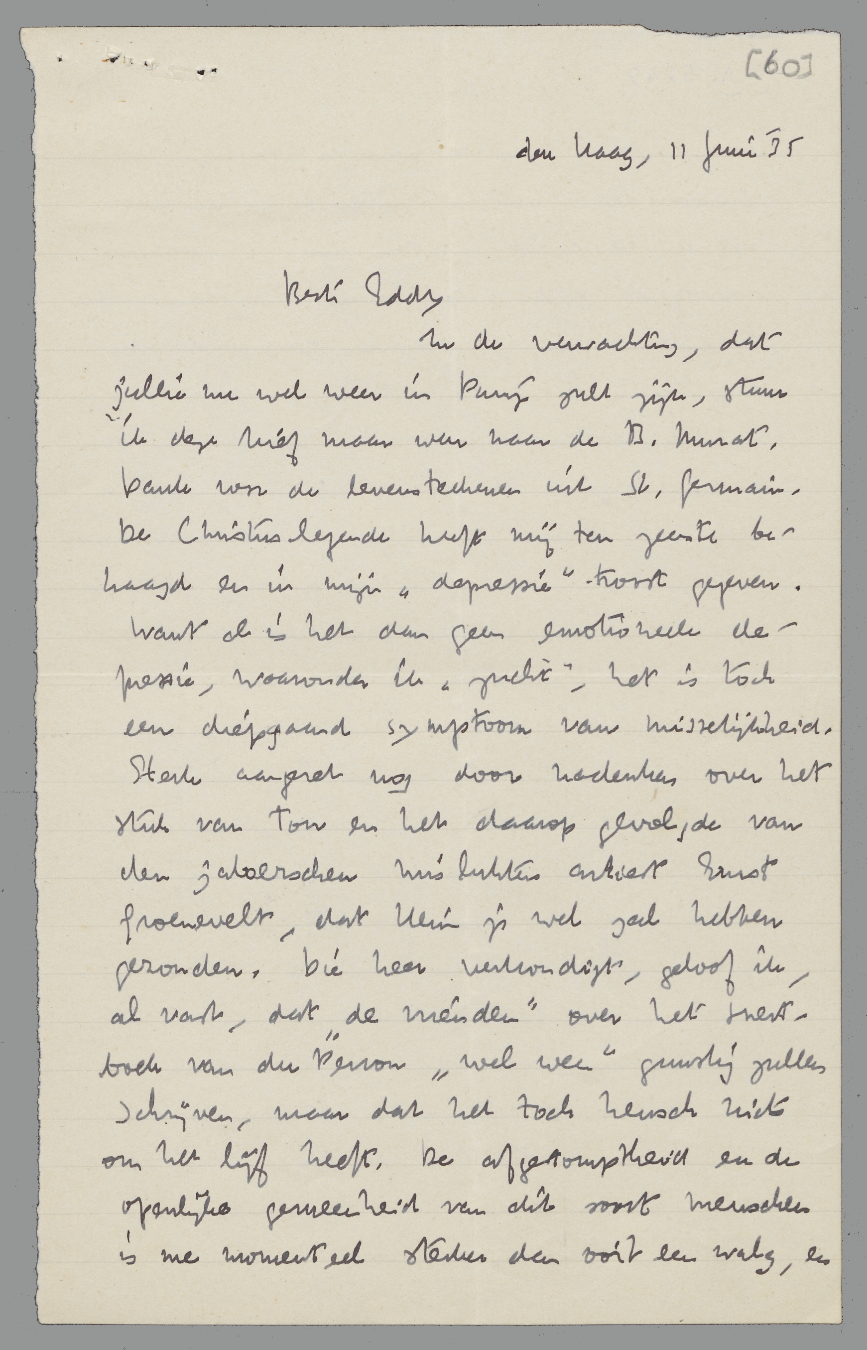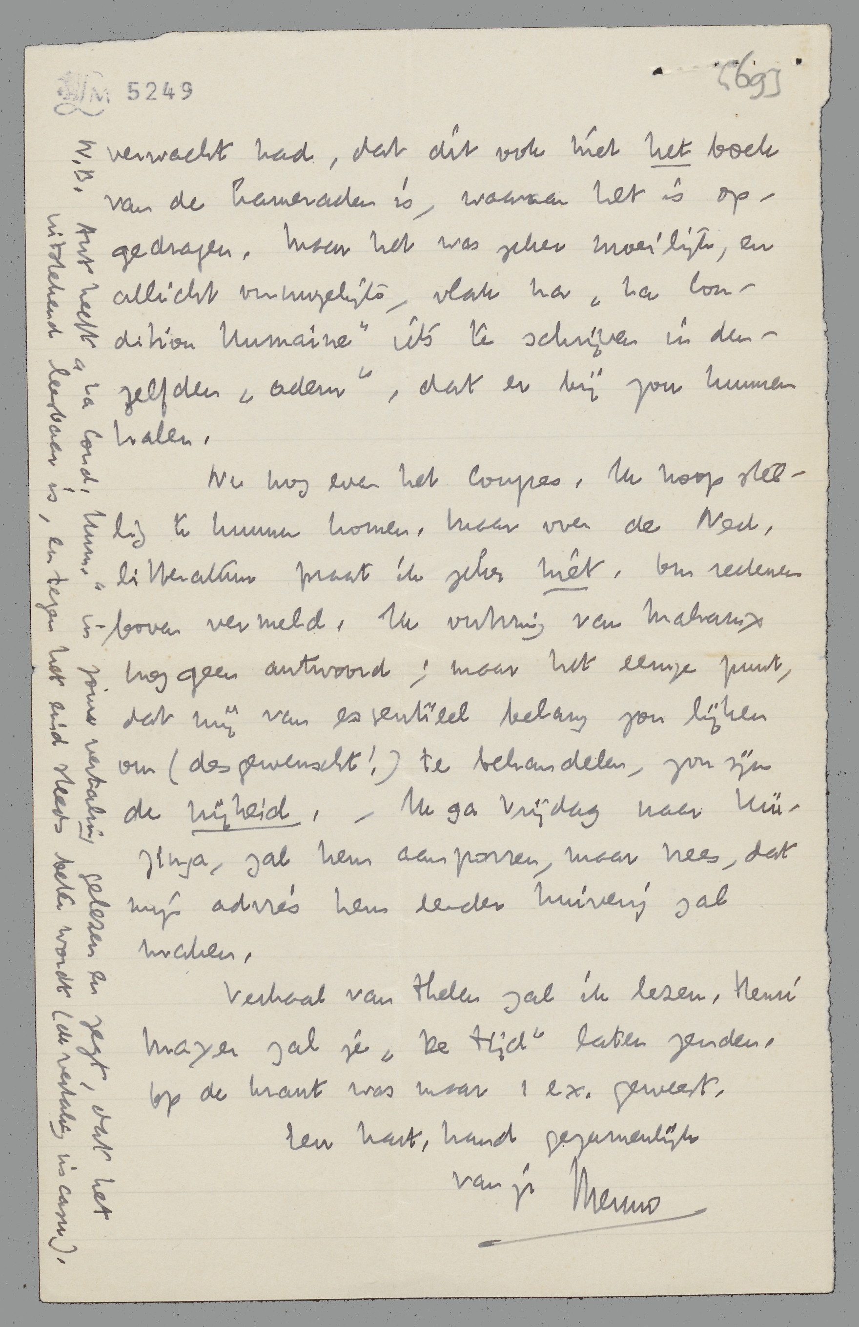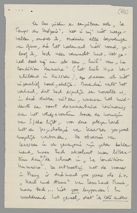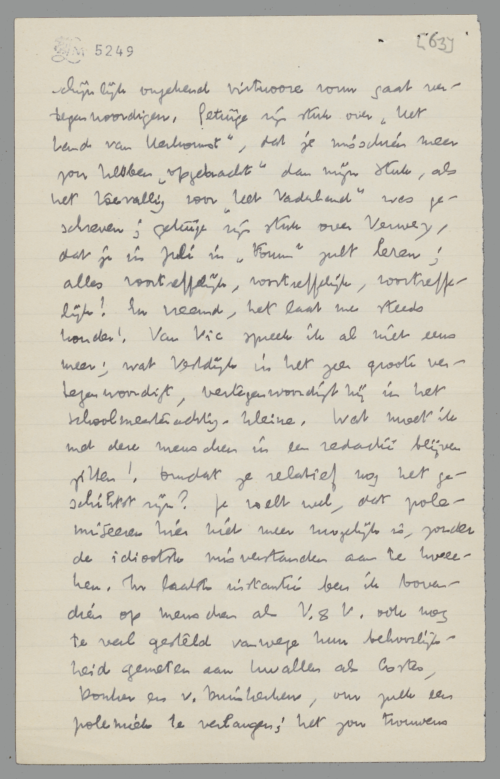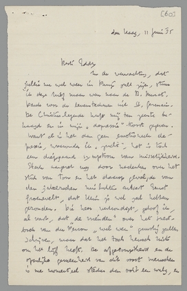 Nu nog even het Congres. Ik hoop stellig te kunnen komen. Maar over de Ned. litteratuur praat ik zeker niet. Om redenen boven vermeld. Ik ontving van Malraux nog geen antwoord; maar het eenige punt, dat mij van essentieel belang zou lijken om (desgewenscht!) te behandelen, zou zijn de vrijheid. Ik ga Vrijdag naar Huizinga, zal hem aanporren, maar vrees, dat mijn advies hem eerder huiverig zal maken.