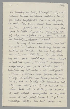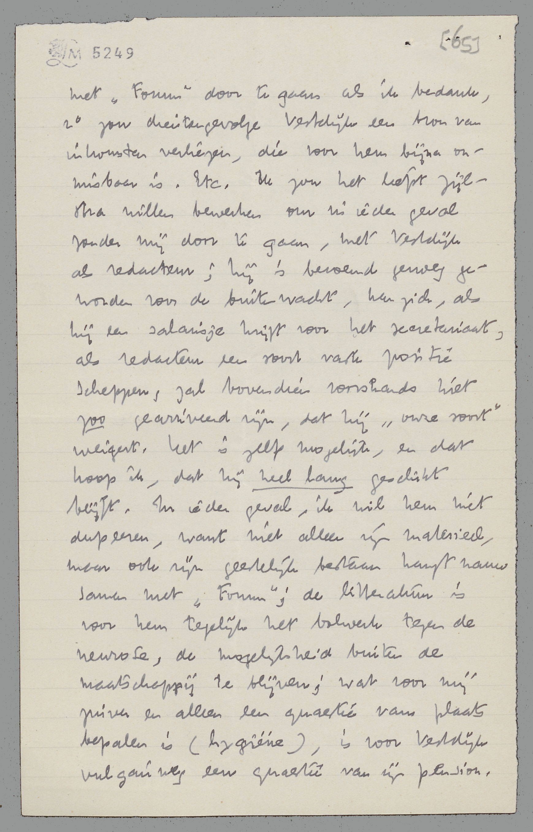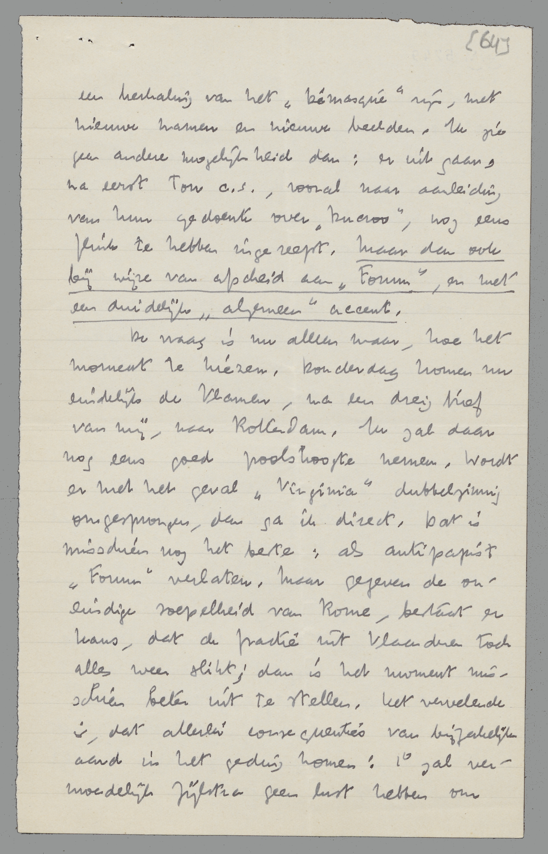 De vraag is nu alleen maar, hoe het moment te kiezen. Donderdag komen nu eindelijk de Vlamen, na een dreigbrief van mij, naar Rotterdam. Ik zal daar nog eens goed poolshoogte nemen. Wordt er met het geval Virginia dubbelzinnig omgesprongen, dan ga ik direct. Dat is misschien nog het beste: als antipapist Forum verlaten. Maar gegeven de oneindige soepelheid van Rome, bestaat er kans, dat de fractie uit Vlaanderen toch alles weer slikt; dan is het moment misschien beter uit te stellen. Het vervelende is, dat allerlei consequenties van bijzakelijke aard in het geding komen: 1o zal vermoedelijk Zijlstra geen lust hebben om met Forum door te gaan als ik bedank, 2o zou dientengevolge Vestdijk een bron van inkomsten verliezen, die voor hem bijna onmisbaar is. Etc. Ik zou het liefst Zijlstra willen bewerken om in ieder geval zonder mij door te gaan, met Vestdijk als redacteur; hij is beroemd genoeg geworden voor de buitenwacht, kan zich, als hij een salarisje krijgt voor het secretariaat, als redacteur een soort vaste positie scheppen, zal bovendien voorshands niet zoo gearriveerd zijn, dat hij ‘onze soort’ weigert. Het is zelfs mogelijk, en dat hoop ik, dat hij heel lang geschikt blijft. In ieder geval, ik wil hem niet dupeeren, want niet alleen zijn materieel, maar ook zijn geestelijk bestaan hangt nauw samen met Forum; de litteratuur is voor hem tegelijk het bolwerk tegen de neurose, de mogelijkheid buiten de maatschappij te blijven; wat voor mij zuiver en alleen een quaestie van plaats bepalen is (hygiëne), is voor Vestdijk vulgairweg een quaestie van zijn pension. En ik wensch in geen enkel opzicht unfair tegen hem te zijn, omdat hij het tegen mij ook niet is. Waarschijnlijk voelt hij niet eens, dat er een kloof is ontstaan, dat hij heel goed in het Critisch Bulletin past als de opperste en ver boven het tuig verheven keurmeester; zijn excuses over het feit, dat hij in dat prulblaadje schrijft, worden trouwens steeds zwakker, het geldelijk motief verdwijnt steeds meer naar den achtergrond.