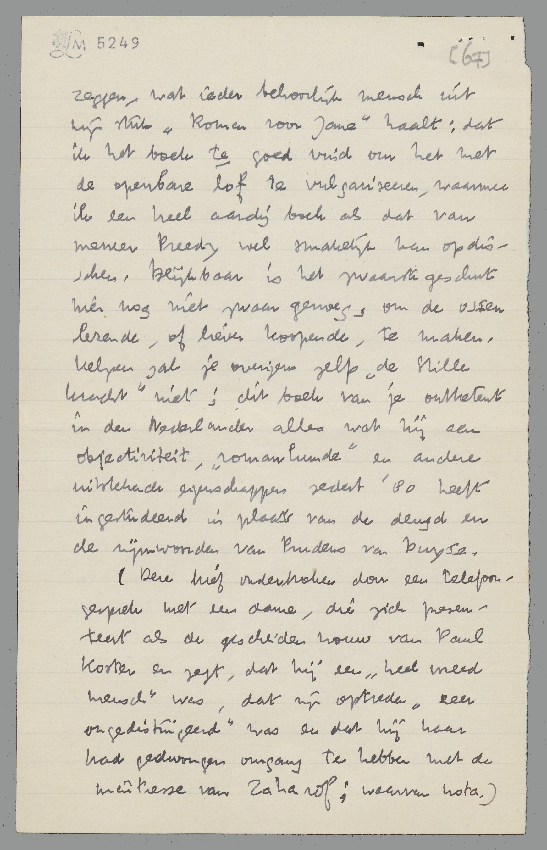 (Deze brief onderbroken door een telefoongesprek met een dame, die zich presenteert als de gescheiden vrouw van Paul Koster en zegt, dat hij een ‘heel wreed mensch’ was, dat zijn optreden ‘zeer ongedistingeerd’ was en dat hij haar had gedwongen omgang te hebben met de maîtresse van Zaharof; waarvan nota.)