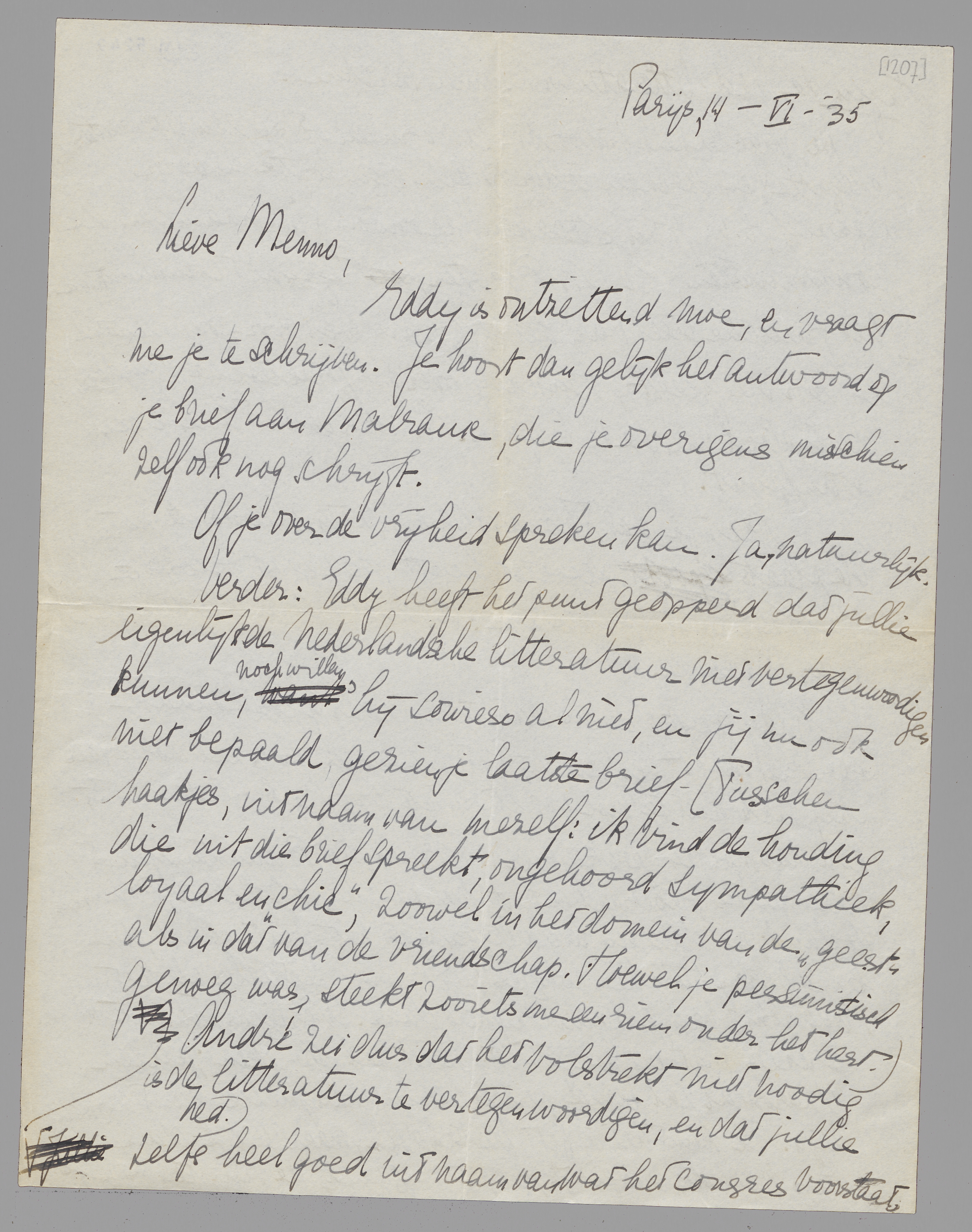 Eddy is ontzettend moe, en vraagt me je te schrijven. Je hoort dan gelijk het antwoord op je brief aan Malraux, die je overigens misschien zelf ook nog schrijft.