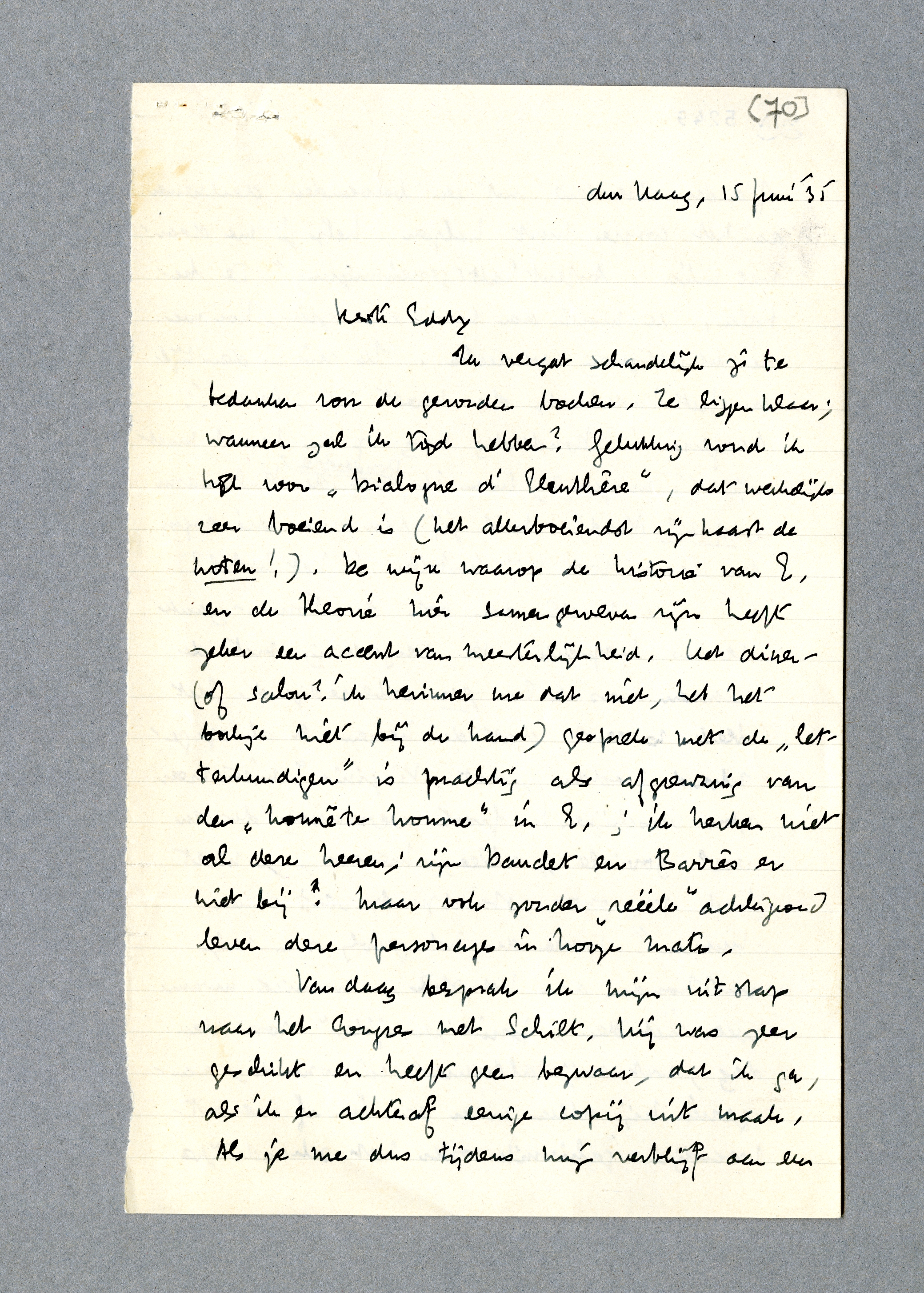 Ik vergat schandelijk je te bedanken voor de gezonden boeken. Ze liggen klaar; wanneer zal ik tijd hebben? Gelukkig vond ik tijd voor Dialogue d'Eleuthère, dat werkelijk zeer boeiend is (het allerboeiendst zijn haast de noten!). De wijze waarop de historie van E. en de theorie hier samengeweven zijn heeft zeker een accent van meesterlijkheid. Het diner- (of salon? ik herinner me dat niet, heb het boekje niet bij de hand) gesprek met de ‘letterkundigen’ is prachtig als afgrenzing van den ‘honnête homme’ in E.; ik herken niet al deze heeren; zijn Daudet en Barrès er niet bij? Maar ook zonder ‘reëele’ achtergrond leven deze personages in hooge mate.