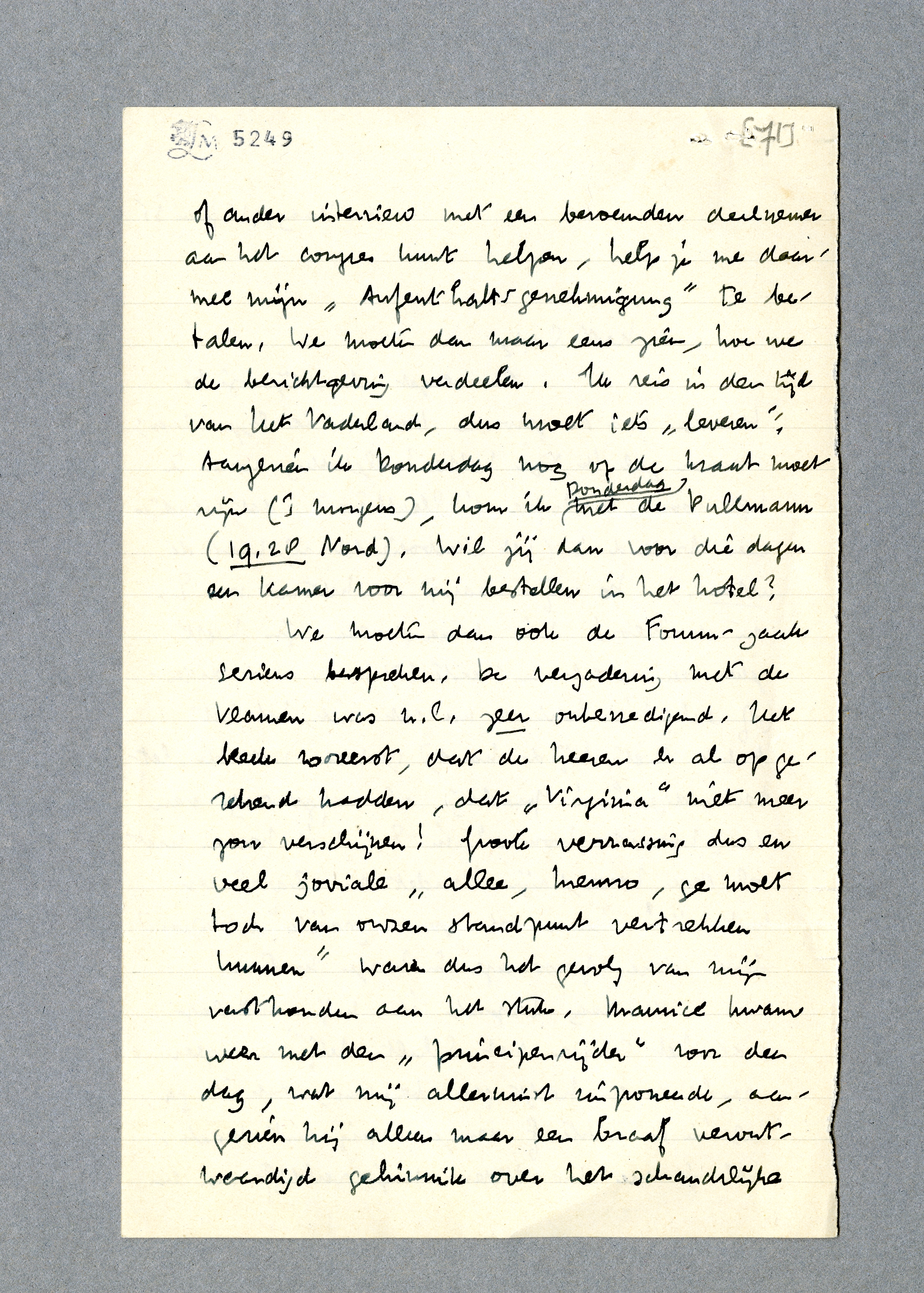 Vandaag besprak ik mijn uitstap naar het Congres met Schilt. Hij was zeer geschikt en heeft geen bezwaar, dat ik ga, als ik er achteraf eenige copij uit maak. Als je me dus tijdens mijn verblijf aan een of ander interview met een beroemden deelnemer aan het congres kunt helpen, help je me daarmee mijn ‘Aufenthaltsgenehmigung’ te betalen. We moeten dan maar eens zien, hoe we de berichtgeving verdeelen. Ik reis in den tijd van Het Vaderland, dus moet iets ‘leveren’. Aangezien ik Donderdag nog op de krant moet zijn ('s morgens), kom ik Donderdag met de Pullmann (19.28 Nord). Wil jij dan voor die dagen een kamer voor mij bestellen in het hotel?