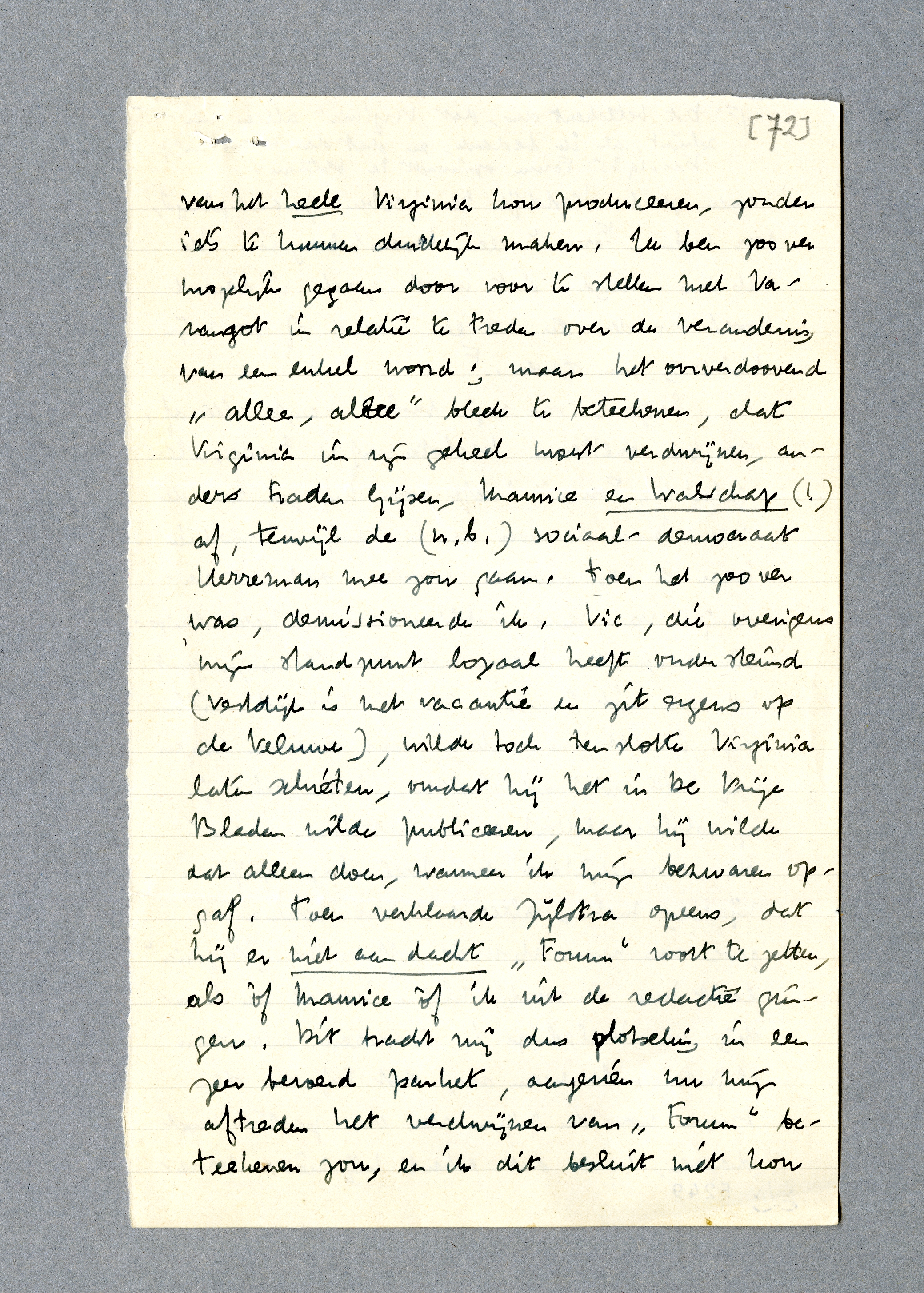 We moeten dan ook de Forum-zaak serieus bespreken. De vergadering met de Vlamen was n.l. zeer onbevredigend. Het bleek vooreerst, dat de heeren er al op gerekend hadden, dat Virginia niet meer zou verschijnen! Groote verrassing dus en veel joviale ‘allee, Menno, ge moet toch van onzen standpunt vertrekken kunnen’ waren dus het gevolg van mijn vasthouden aan het stuk. Maurice kwam weer met den ‘principenrijder’ voor den dag, wat mij allerminst imponeerde, aangezien hij alleen maar een braaf verontwaardigd gehinnik over het schandelijke van het heele Virginia kon produceeren, zonder iets te kunnen duidelijk maken. Ik ben zoover mogelijk gegaan door voor te stellen met Varangot in relatie te treden over de verandering van een enkel woord; maar het oorverdoovend ‘allee, allee’ bleek te beteekenen, dat Virginia in zijn geheel moest verdwijnen, anders traden Gijsen, Maurice en Walschap(!) af, terwijl de (n.b.) sociaal-democraat Herreman mee zou gaan. Toen het zoover was, demissioneerde ik. Vic, die overigens mijn standpunt loyaal heeft ondersteund (Vestdijk is met vacantie en zit ergens op de Veluwe), wilde toch tenslotte Virginia laten schieten, omdat hij het in De Vrije Bladen wilde publiceeren, maar hij wilde dat alleen doen, wanneer ik mijn bezwaren opgaf. Toen verklaarde Zijlstra opeens, dat hij er niet aan dacht Forum voort te zetten, als òf Maurice òf ik uit de redactie gingen. Dit bracht mij dus plotseling in een zeer beroerd parket, aangezien nu mijn aftreden het verdwijnen van Forum beteekenen zou, en ik dit besluit niet kon nemen zonder Vestdijk te hebben geraadpleegd, voor wien Forum een levensbelang is. Ik heb dus gezegd, dat ik de zaak in beraad moest houden en na een maand of zoo mijn beslissing zou geven. [Dat beteekent dus, dat Virginia alleen verschijnt, als ik bedank, en dat dan tevens in Dec. 1935 Forum ophoudt te bestaan.]