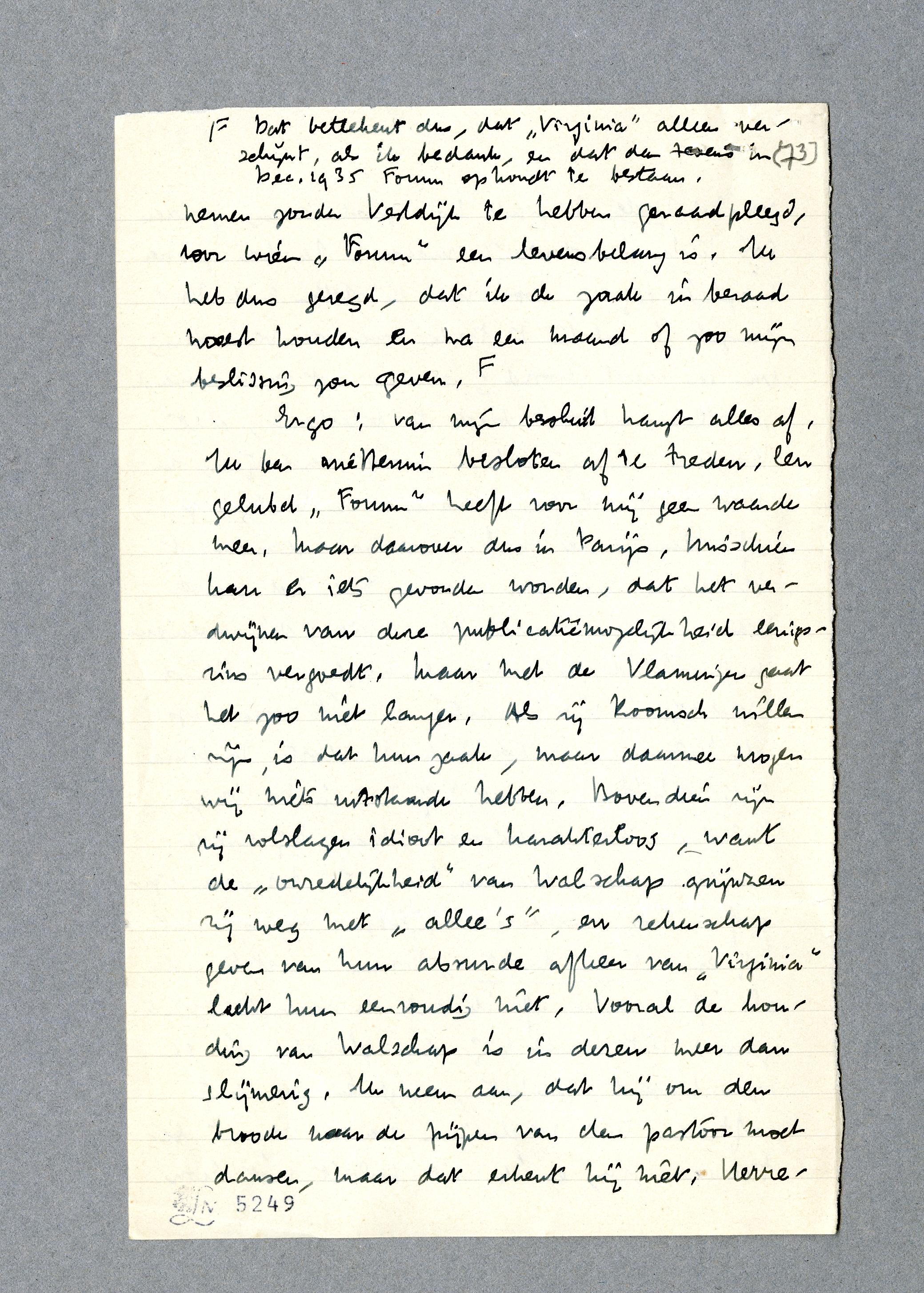 Ergo: van mijn besluit hangt alles af. Ik ben niettemin besloten af te treden. Een gelubd Forum heeft voor mij geen waarde meer. Maar daarover dus in Parijs. Misschien kan er iets gevonden worden, dat het verdwijnen van deze publicatiemogelijkheid eenigszins vergoedt. Maar met de Vlamingen gaat het zoo niet langer. Als zij Roomsch willen zijn, is dat hun zaak, maar daarmee mogen wij niets uitstaande hebben. Bovendien zijn zij volslagen idioot en karakterloos, want de ‘onzedelijkheid’ van Walschap grijnzen zij weg met ‘allee's’, en rekenschap geven van hun absurde afkeer van Virginia lukt hun eenvoudig niet. Vooral de houding van Walschap is in dezen meer dan slijmerig. Ik neem aan, dat hij om den broode naar de pijpen van den pastoor moet dansen, maar dat erkent hij niet. Herreman is tout simplement een geschikte nul.
