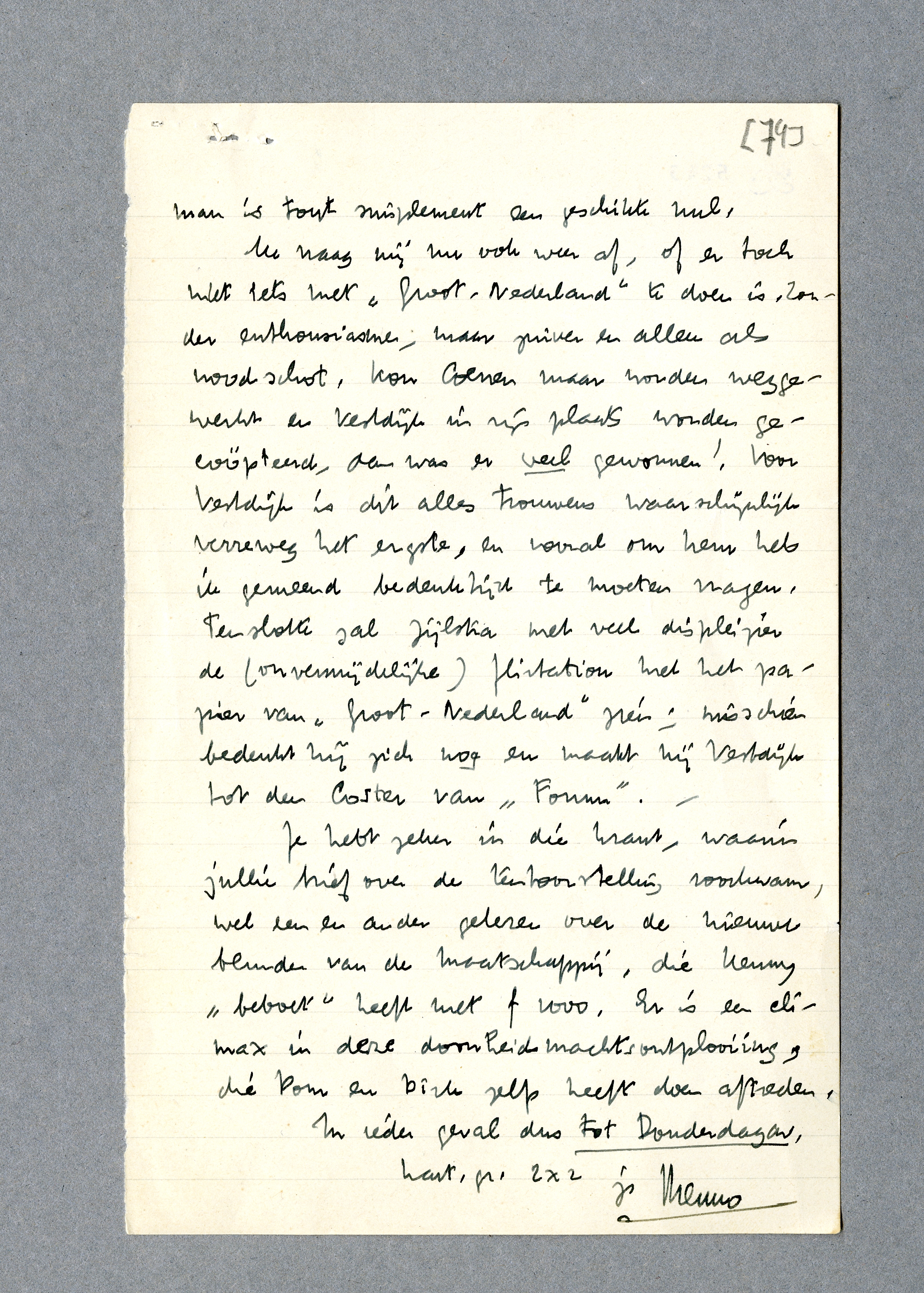 Ik vraag mij nu ook weer af, of er toch niet iets met Groot-Nederland te doen is. Zonder enthousiasme, maar zuiver en alleen als noodschot. Kon Coenen maar worden weggewerkt en Vestdijk in zijn plaats worden gecoöpteerd, dan was er veel gewonnen! Voor Vestdijk is dit alles trouwens waarschijnlijk verreweg het ergste, en vooral om hem heb ik gemeend bedenktijd te moeten vragen. Tenslotte zal Zijlstra met veel displeizier de (onvermijdelijke) flirtation met het papier van Groot-Nederland zien; misschien bedenkt hij zich nog en maakt hij Vestdijk tot den Coster van Forum.