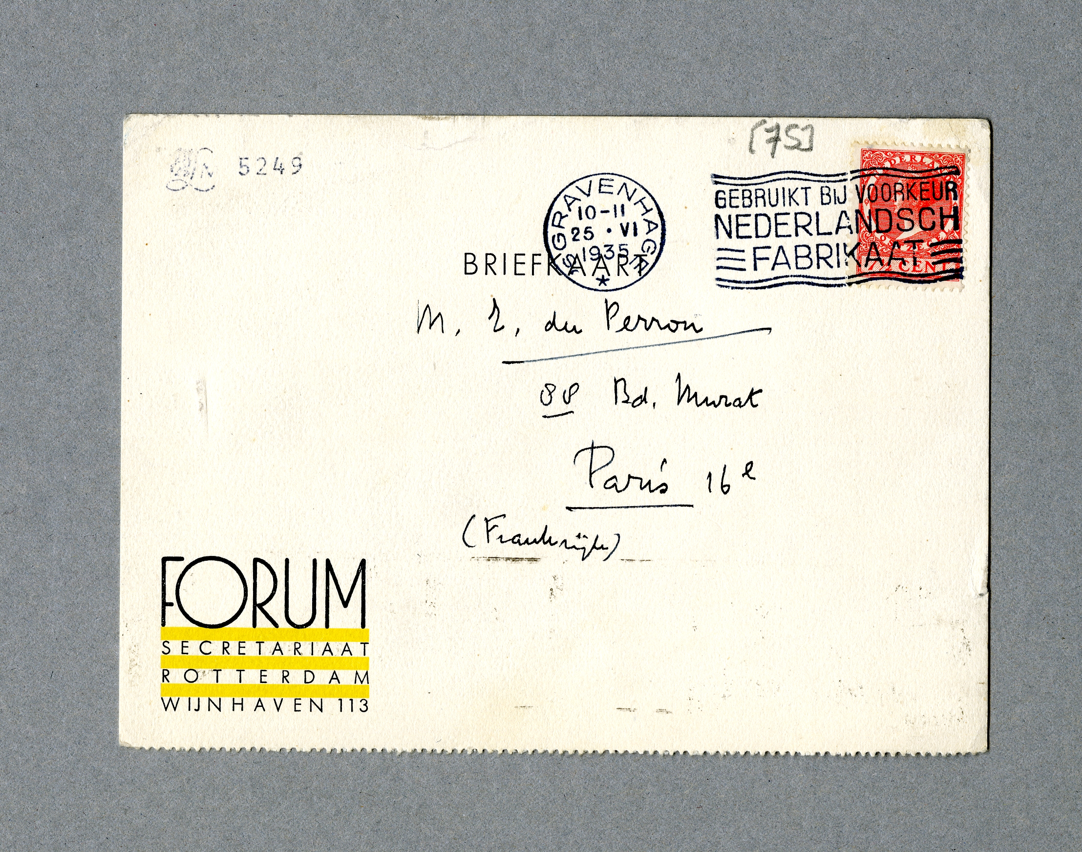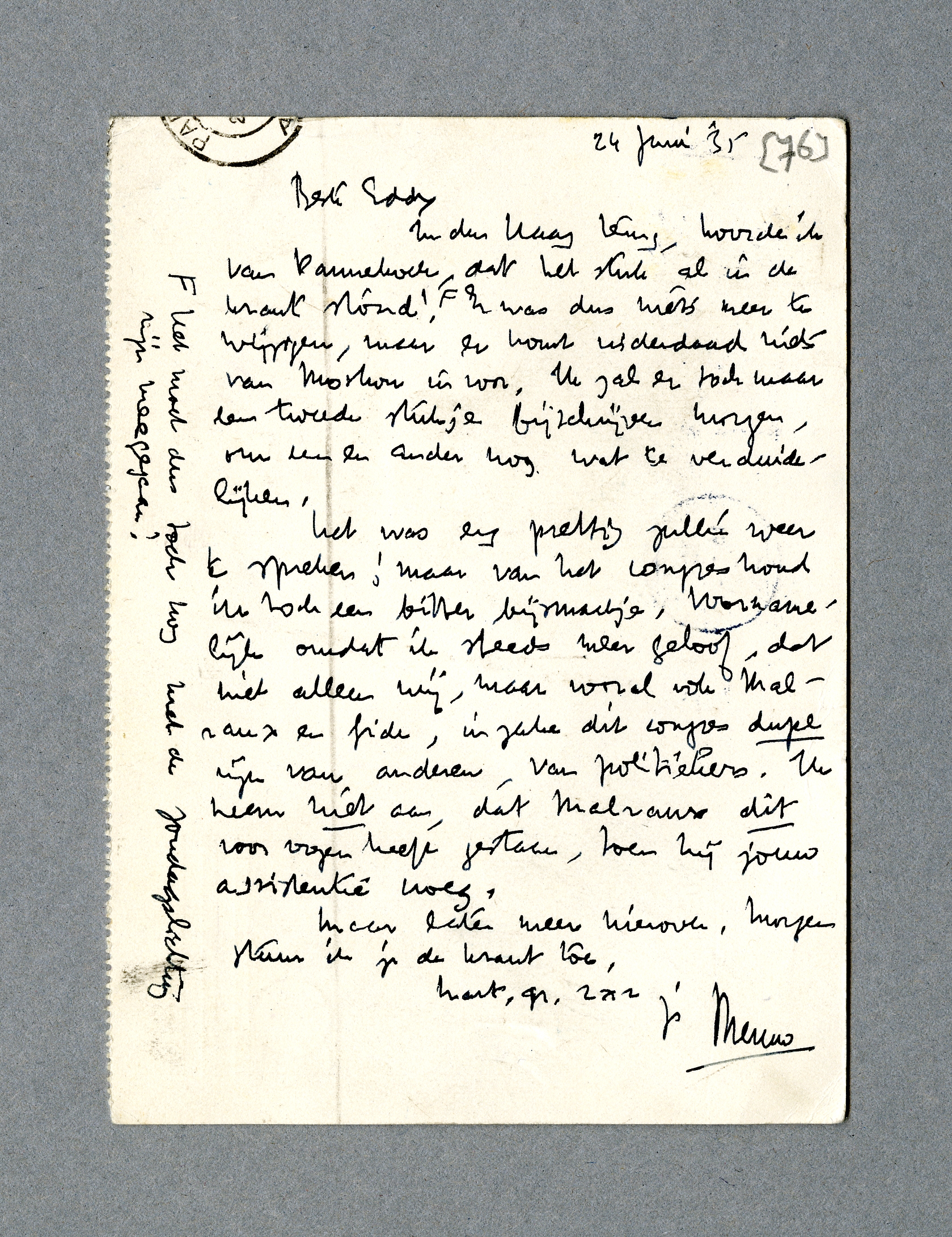 Het was erg prettig jullie weer te spreken; maar van het congres houd ik toch een bitter bijsmaakje. Voornamelijk omdat ik steeds meer geloof, dat niet alleen wij, maar vooral ook Malraux en Gide, inzake dit congres dupe zijn van anderen, van politiekers. Ik neem niet aan, dat Malraux dit voor oogen heeft gestaan, toen hij jouw assistentie vroeg.