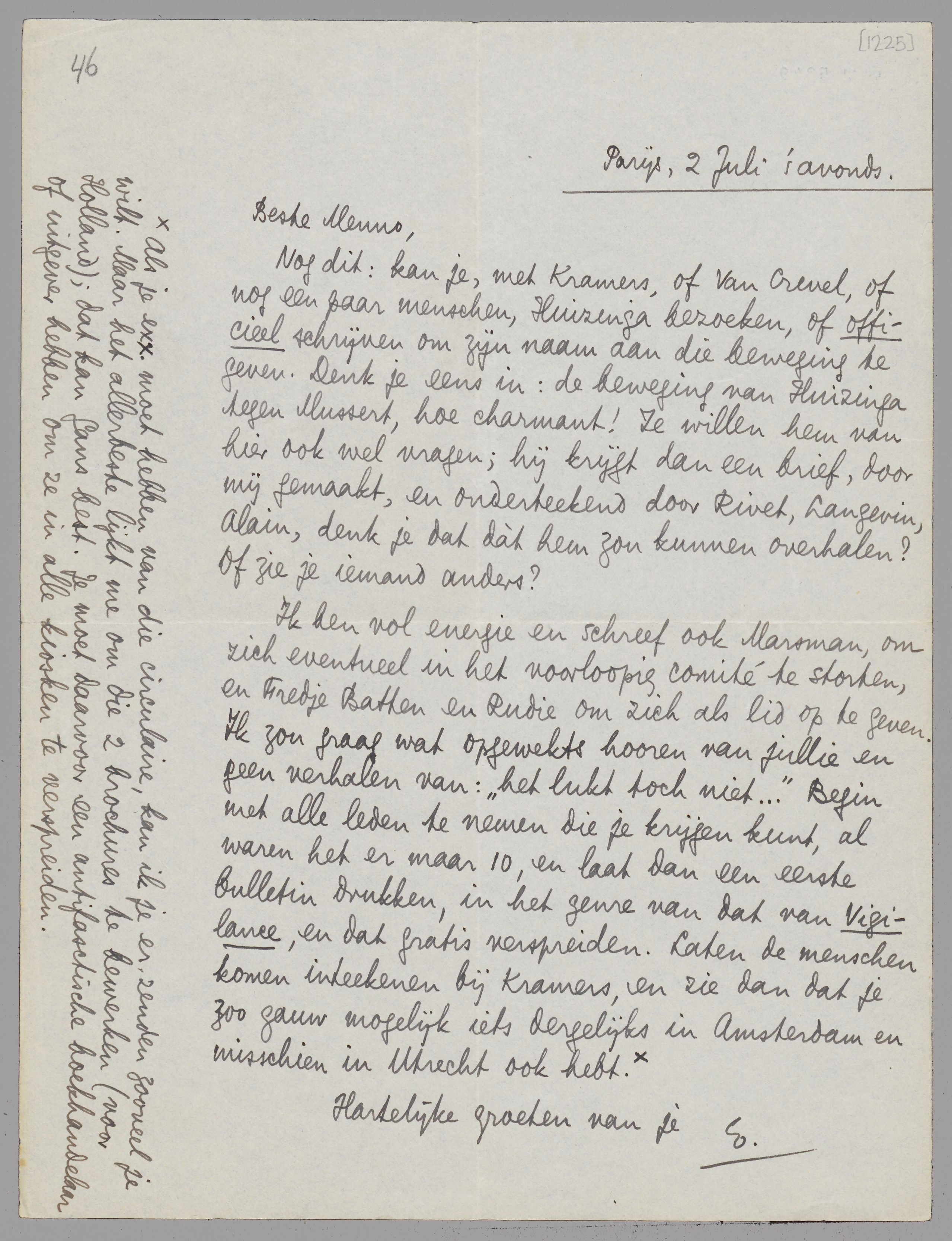 Nog dit: kan je, met Kramers, of Van Crevel, of nog een paar menschen, Huizinga bezoeken, of officieel schrijven om zijn naam aan die beweging te geven. Denk je eens in: de beweging van Huizinga tegen Mussert, hoe charmant! Ze willen hem van hier ook wel vragen; hij krijgt dan een brief, door mij gemaakt, en onderteekend door Rivet, Langevin, Alain, denk je dat dàt hem zou kunnen overhalen? Of zie je iemand anders?