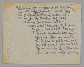 Schrijf mij dus omgaand of Virginia nu niet geplaatst wordt. Dat is eig. alles wat ik weten wil. - Ik zou eig. Vestdijk erg graag ook nu geschreven hebben, maar wacht hiervoor toch maar op jouw antwoord. Hoe meer ik erover nadenk, hoe pijnlijker dit alles mij wordt. En ik ben er zeker van dat Jan dit precies zoo voelt als ik, - wanneer ik alleen voor jou niet meer voldoende ben.