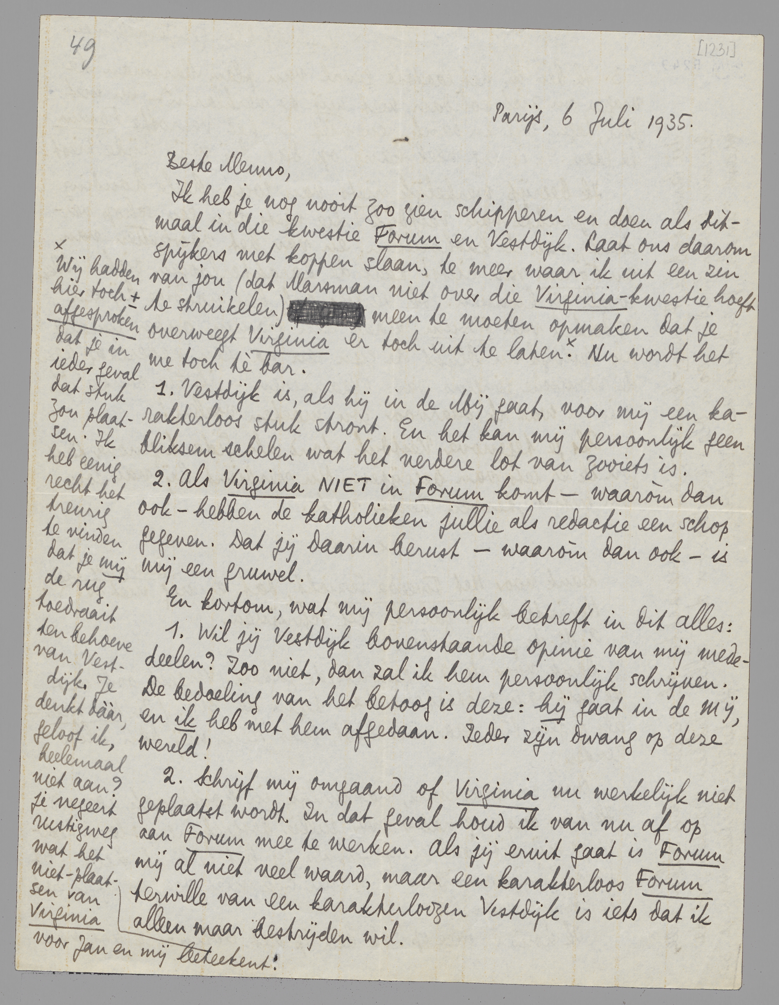 2. Schrijf mij omgaand of Virginia nu werkelijk niet geplaatst wordt. In dat geval houd ik van nu af op aan Forum mee te werken. Als jij eruit gaat is Forum mij al niet veel waard, maar een karakterloos Forum terwille van een karakterloozen Vestdijk is iets dat ik alleen maar bestrijden wil.