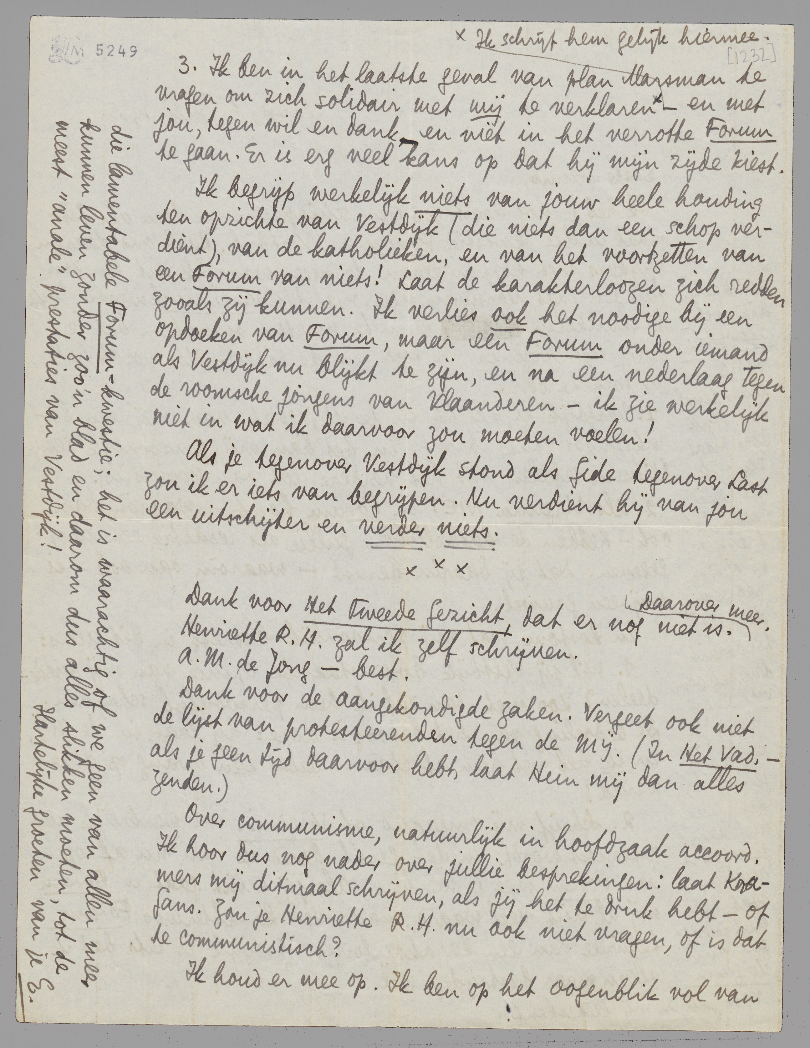 3. Ik ben in het laatste geval van plan Marsman te vragen om zich solidair met mij te verklaren [Ik schrijf hem gelijk hiermee.] - en met jou, tegen wil en dank - en niet in het verrotte Forum te gaan. Er is erg veel kans op dat hij mijn zijde kiest.