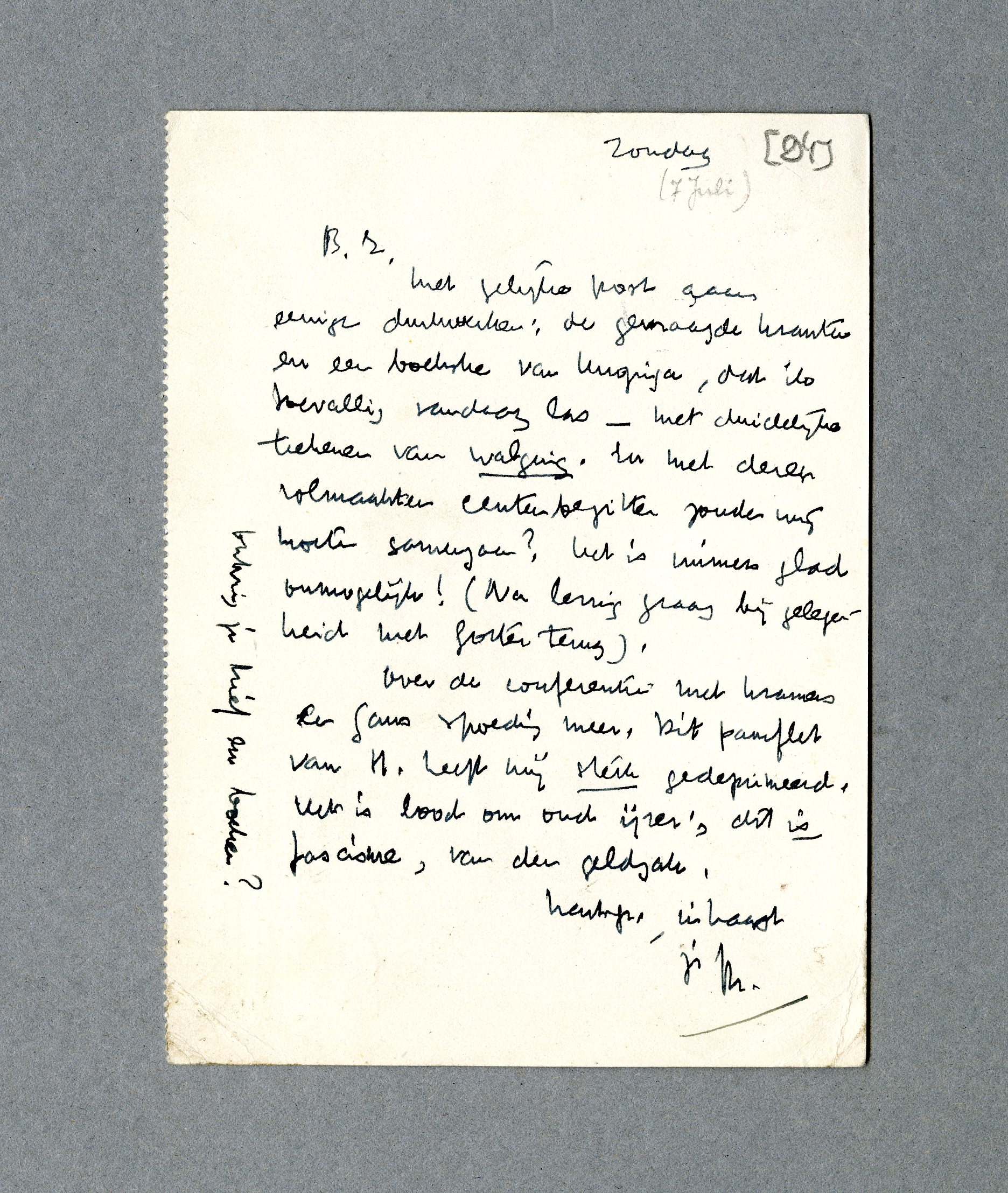 Over de conferentie met Kramers en Gans spoedig meer. Dit pamflet van H. heeft mij sterk gedeprimeerd. Het is lood om oud ijzer; dit is fascisme, van den geldzak.