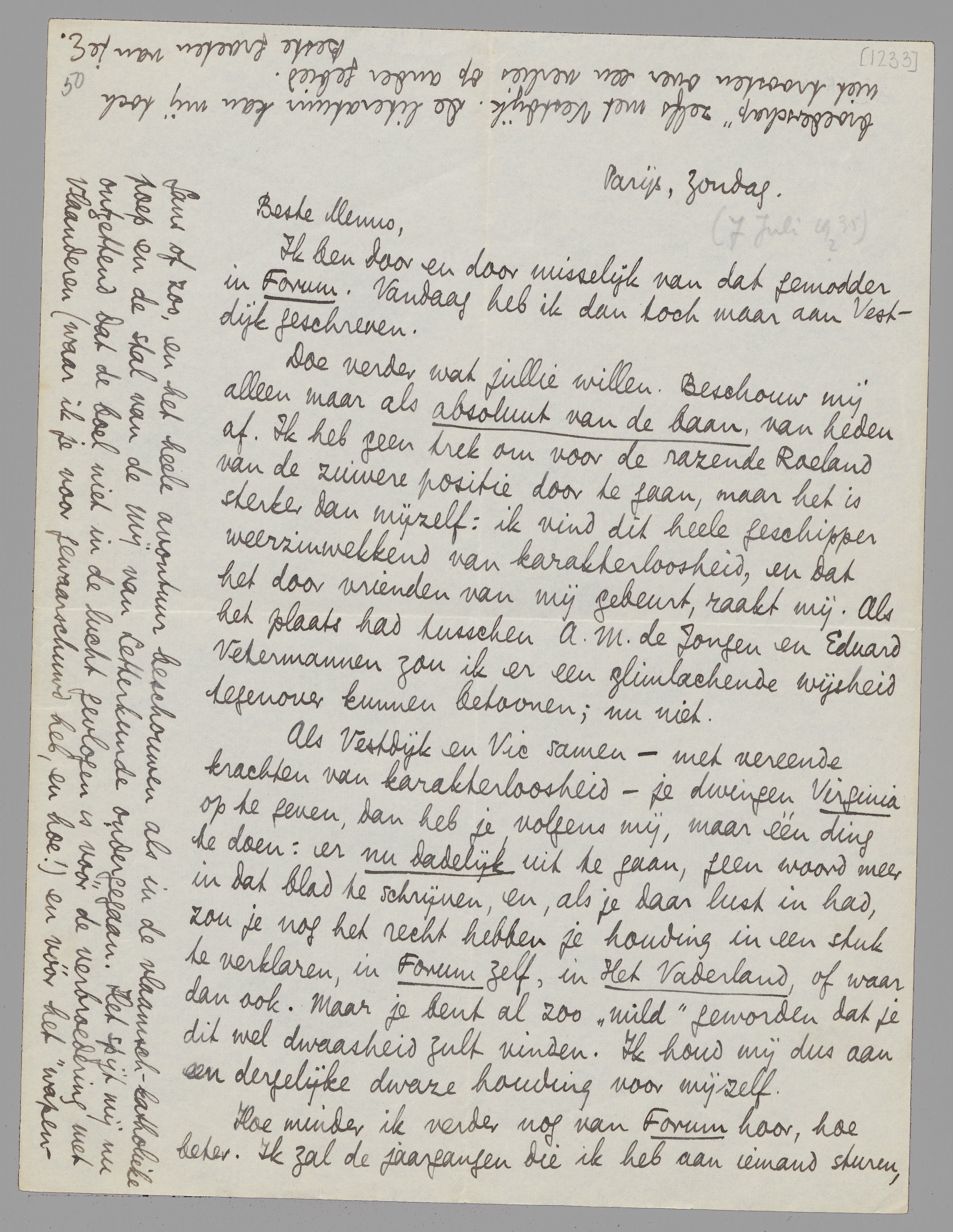 Doe verder wat jullie willen. Beschouw mij alleen maar als absoluut van de baan, van heden af. Ik heb geen trek om voor de razende Roeland van de zuivere positie door te gaan, maar het is sterker dan mijzelf: ik vind dit heele geschipper weerzinwekkend van karakterloosheid, en dat het door vrienden van mij gebeurt, raakt mij. Als het plaats had tusschen A.M. de Jongen en Eduard Vetermannen zou ik er een glimlachende wijsheid tegenover kunnen betoonen; nu niet.