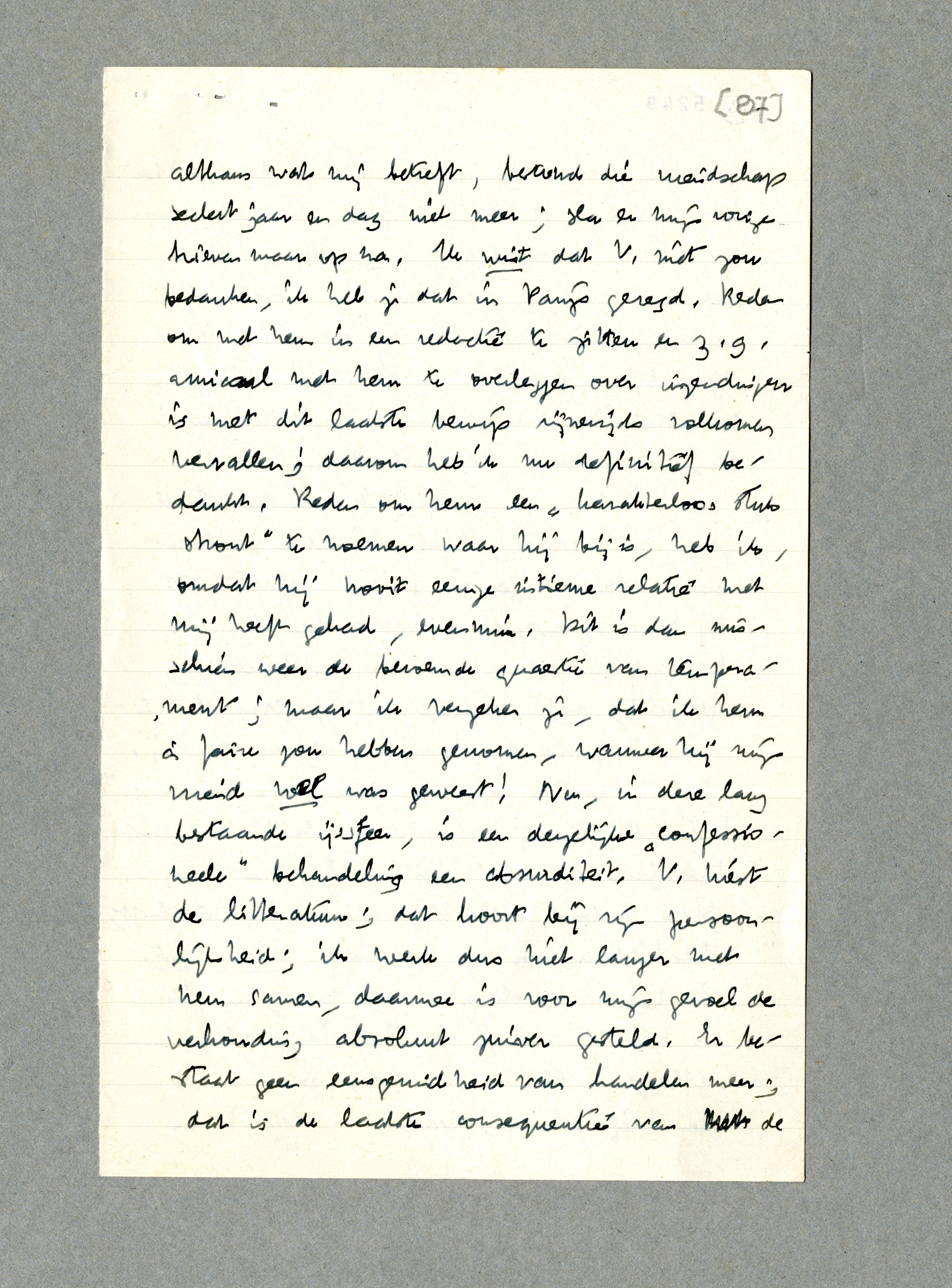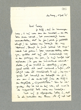 Je brief, dien ik vanmorgen kreeg, is mij weer eens een raadsel - om de toon ervan vooral, het onmiddellijk maar veronderstellen, dat ik jou (zooals je godbetert schrijft) ten behoeve van Vestdijk den rug toedraai, terwijl ik juist precies het omgekeerde heb gedaan! Deze veronderstelling alleen zou, gesteld dat mij iets onduidelijk was in een gedraging van jou, in mijn hoofd niet opkomen; ik zou een misverstand veronderstellen, of een verschil in opvatting, in geen geval echter dit soort verraad. Enfin, dit schijnt weer iets irrationeels te zijn, en aangezien het kennelijk een behoefte van je is om eens in de anderhalf jaar een brief in een dergelijken ‘imperialistischen’ toon te verzenden, leg ik me er bij neer, al vind ik de suppositie toch verre van hartelijk.