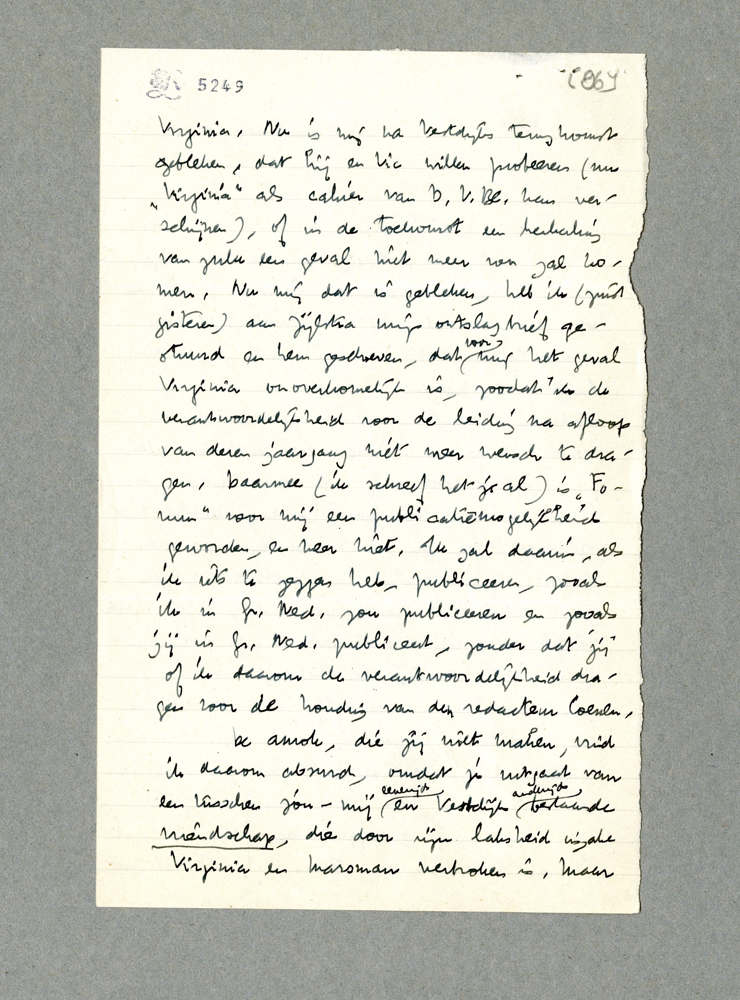 Wat wij ± afgesproken hebben is, dat ik als redacteur van Forum sta of val met Virginia. Nu is mij na Vestdijks terugkomst gebleken, dat hij en Vic willen probeeren (nu Virginia als cahier van D.V.Bl. kan verschijnen), of in de toekomst een herhaling van zulk een geval niet meer voor zal komen. Nu mij dat is gebleken, heb ik (juist gisteren) aan Zijlstra mijn ontslagbrief gestuurd en hem geschreven, dat voor mij het geval Virginia onoverkomelijk is, zoodat ik de verantwoordelijkheid voor de leiding na afloop van dezen jaargang niet meer wensch te dragen. Daarmee (ik schreef het je al) is Forum voor mij een publicatiemogelijkheid geworden, en meer niet. Ik zal daarin, als ik iets te zeggen heb, publiceeren, zooals ik in Gr. Ned. zou publiceeren en zooals jij in Gr. Ned. publiceert, zonder dat jij of ik daarom de verantwoordelijkheid dragen voor de houding van den redacteur Coenen.