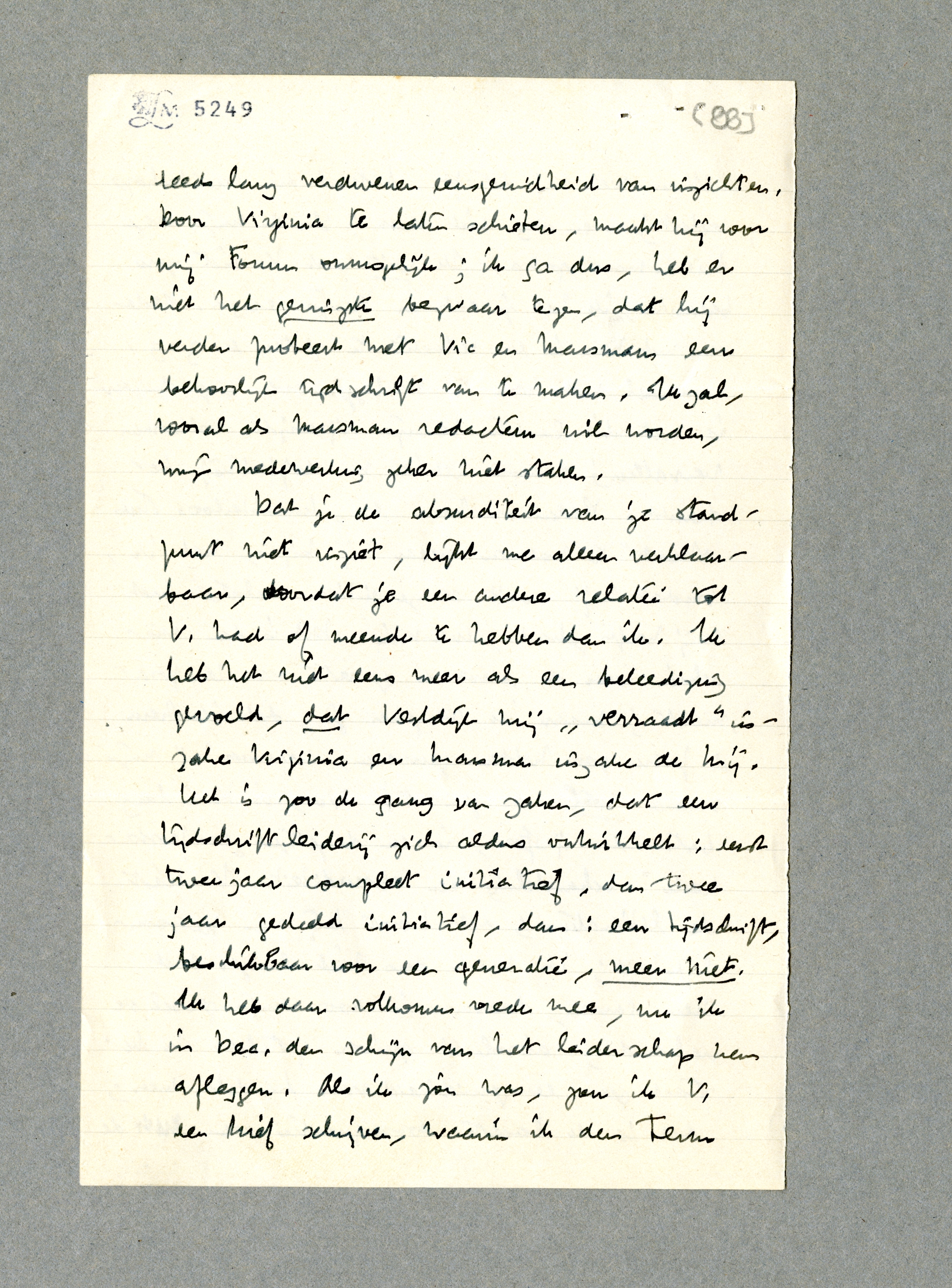 De amok, die jij wilt maken, vind ik daarom absurd, omdat je uitgaat van een tusschen jou-mij eenerzijds en Vestdijk anderzijds bestaande vriendschap, die door zijn laksheid inzake Virginia en Marsman verbroken is. Maar althans wat mij betreft, bestond die vriendschap sedert jaar en dag niet meer; sla er mijn vorige brieven maar op na. Ik wist dat V. niet zou bedanken, ik heb je dat in Parijs gezegd. Reden om met hem in een redactie te zitten en z.g. amicaal met hem te overleggen over inzendingen is met dit laatste bewijs mijnerzijds volkomen vervallen; daarom heb ik nu definitief bedankt. Reden om hem een ‘karakterloos stuk stront’ te noemen waar hij bij is, heb ik, omdat hij nooit eenige intieme relatie met mij heeft gehad, evenmin. Dit is dan misschien weer de beroemde quaestie van temperament; maar ik verzeker je, dat ik hem à faire zou hebben genomen, wanneer hij mijn vriend wel was geweest! Nu, in deze lang bestaande ijssfeer, is een dergelijke ‘confessioneele’ behandeling een absurditeit. V. kiest de litteratuur; dat hoort bij zijn persoonlijkheid; ik werk dus niet langer met hem samen, daarmee is voor mijn gevoel de verhouding absoluut zuiver gesteld. Er bestaat geen eensgezindheid van handelen meer; dat is de laatste consequentie van de reeds lang verdwenen eensgezindheid van inzichten. Door Virginia te laten schieten, maakt hij voor mij Forum onmogelijk; ik ga dus, heb er niet het geringste bezwaar tegen, dat hij verder probeert met Vic en Marsman een behoorlijk tijdschrift van te maken. Ik zal, vooral als Marsman redacteur wil worden, mijn medewerking zeker niet staken.