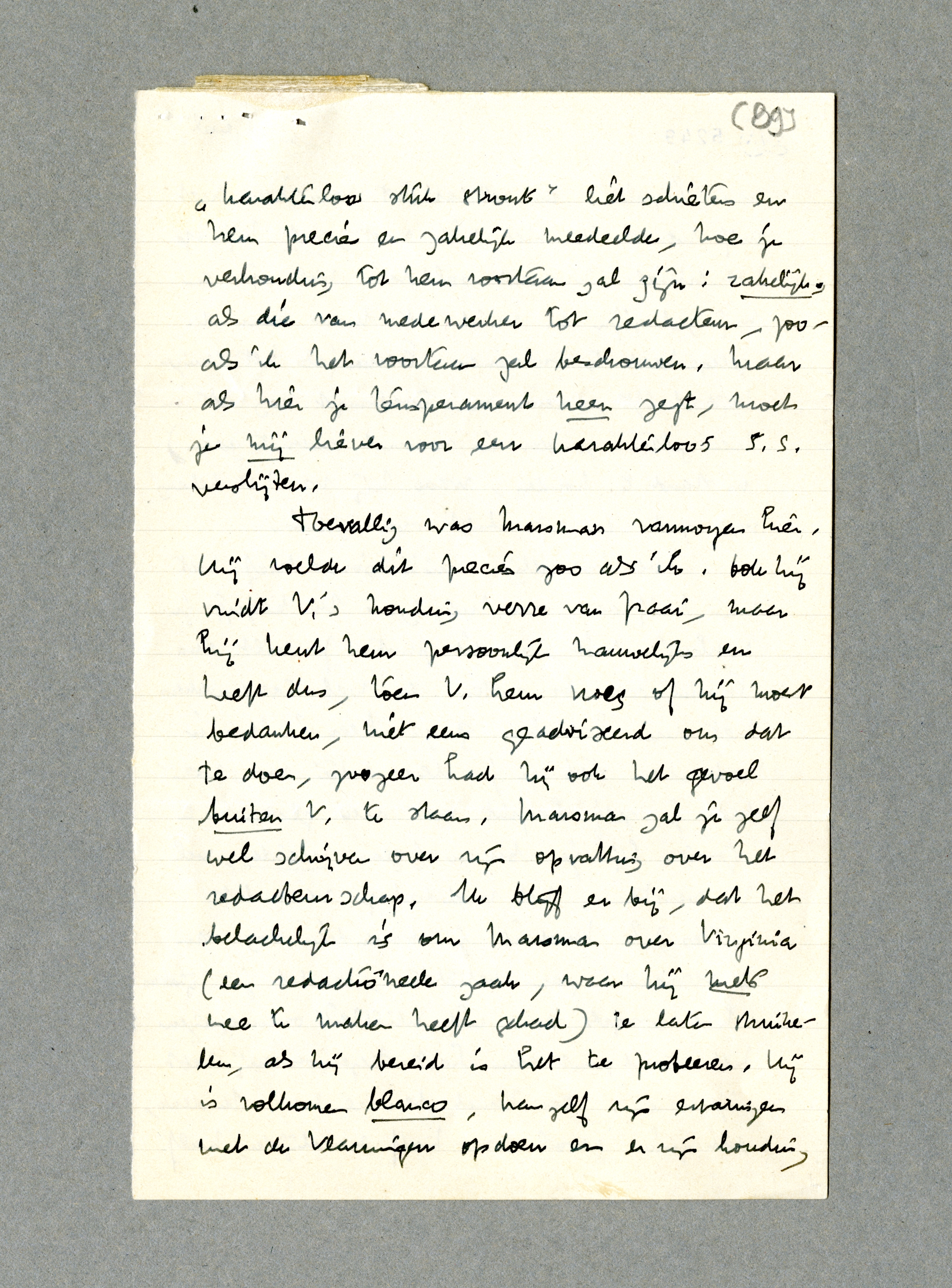 Toevallig was Marsman vanmorgen hier. Hij voelde dit precies zoo als ik. Ook hij vindt V.'s houding verre van fraai, maar hij kent hem persoonlijk nauwelijks en heeft dus, toen V. hem vroeg of hij moest bedanken, niet eens geadviseerd om dat te doen, zoozeer had hij ook het gevoel buiten V. te staan. Marsman zal je zelf wel schrijven over zijn opvatting over het redacteurschap. Ik blijf er bij, dat het belachelijk is om Marsman over Virginia (een redactioneele zaak, waar hij niets mee te maken heeft gehad) te laten struikelen, als hij bereid is het te probeeren. Hij is volkomen blanco, kan zelf zijn ervaringen met de Vlamingen opdoen en er zijn houding naar bepalen. De solidariteit van hem in dit geval met mij wensch ik niet; ik weet, dat hij op het critieke moment solidair met jou en mij zal zijn en vind het dwaas hem de gelegenheid te ontnemen Forum (als het eenige tijdschrift, waar men überhaupt nog iets in kan zetten zonder in rommel onder te gaan) in stand te houden, waar hij van het belang van zulk een tijdschrift overtuigd is.