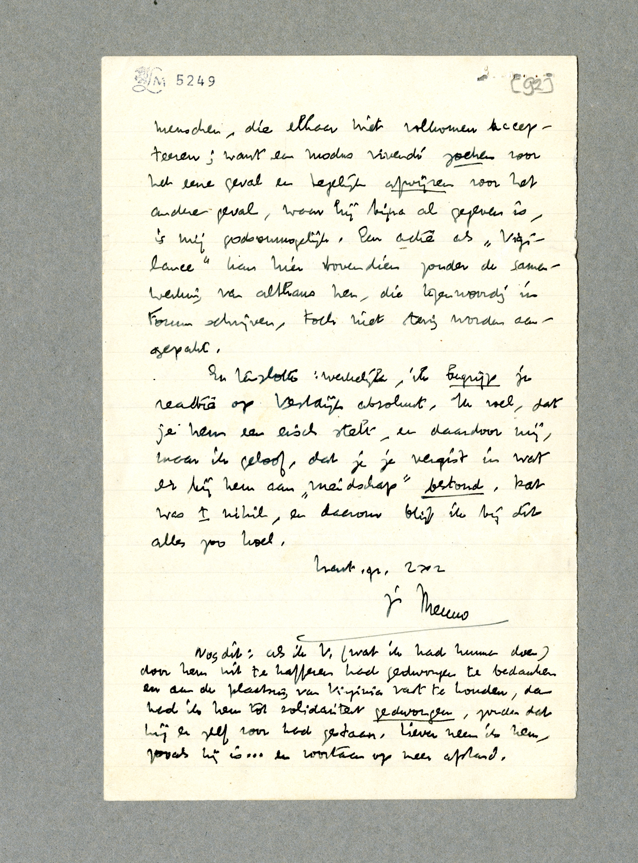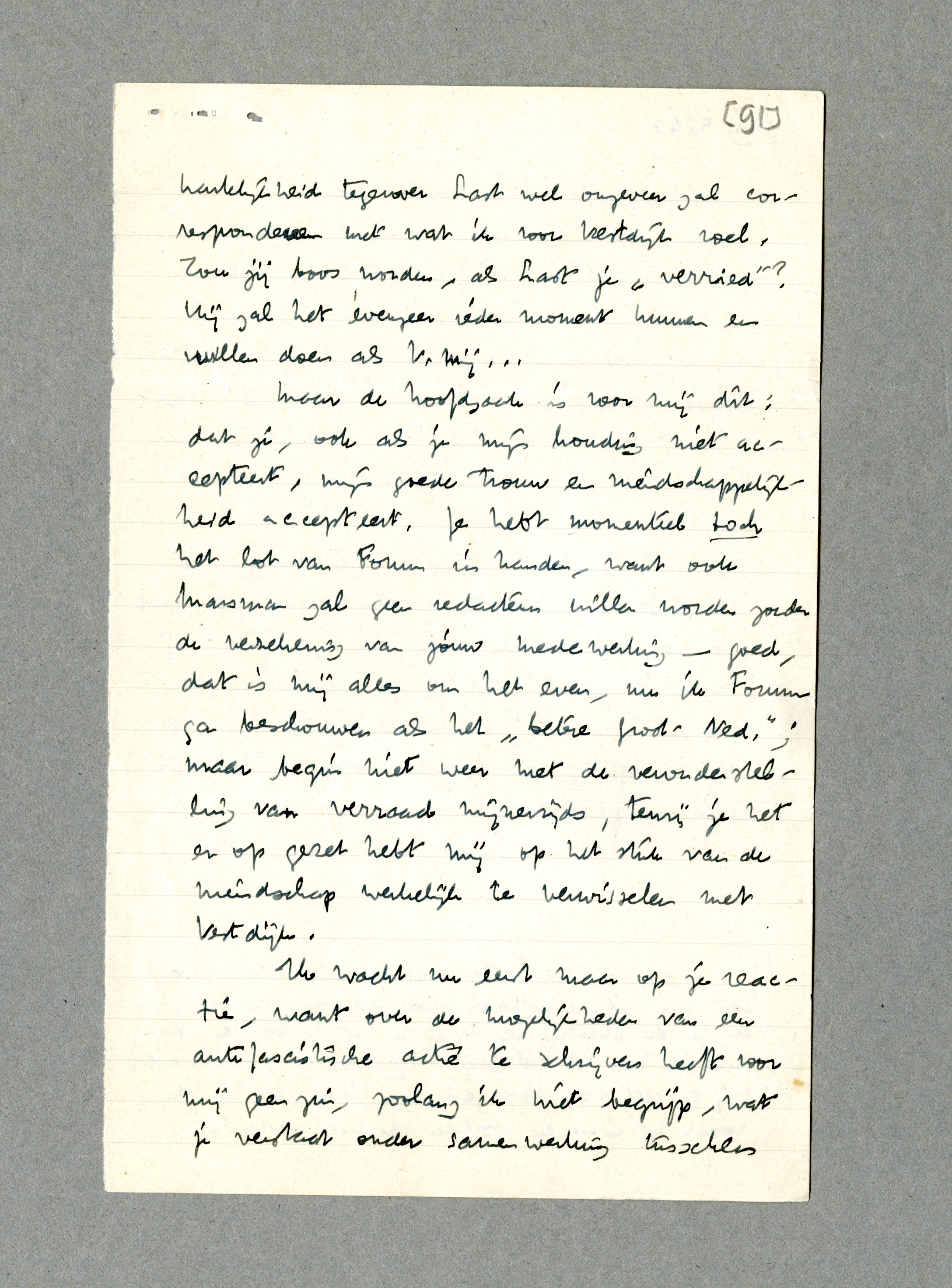 Ik wacht nu eerst maar op je reactie, want over de mogelijkheden van een antifascistische actie te schrijven heeft voor mij geen zin, zoolang ik niet begrijp, wat je verstaat onder samenwerking tusschen menschen, die elkaar niet volkomen accepteeren; want een modus vivendi zoeken voor het eene geval en tegelijk afwijzen voor het andere geval, waar hij bijna al gegeven is, is mij godsonmogelijk. Een actie als Vigilance kan hier bovendien zonder de samenwerking van althans hen, die tegenwoordig in Forum schrijven, toch niet stevig worden aangepakt. En tenslotte: werkelijk, ik begrijp je reactie op Vestdijk absoluut. Ik voel, dat je hem een eisch stelt, en daardoor mij, maar ik geloof, dat je je vergist in wat er bij hem aan ‘vriendschap’ bestond. Dat was ± nihil, en daarom blijf ik bij dit alles zoo koel.