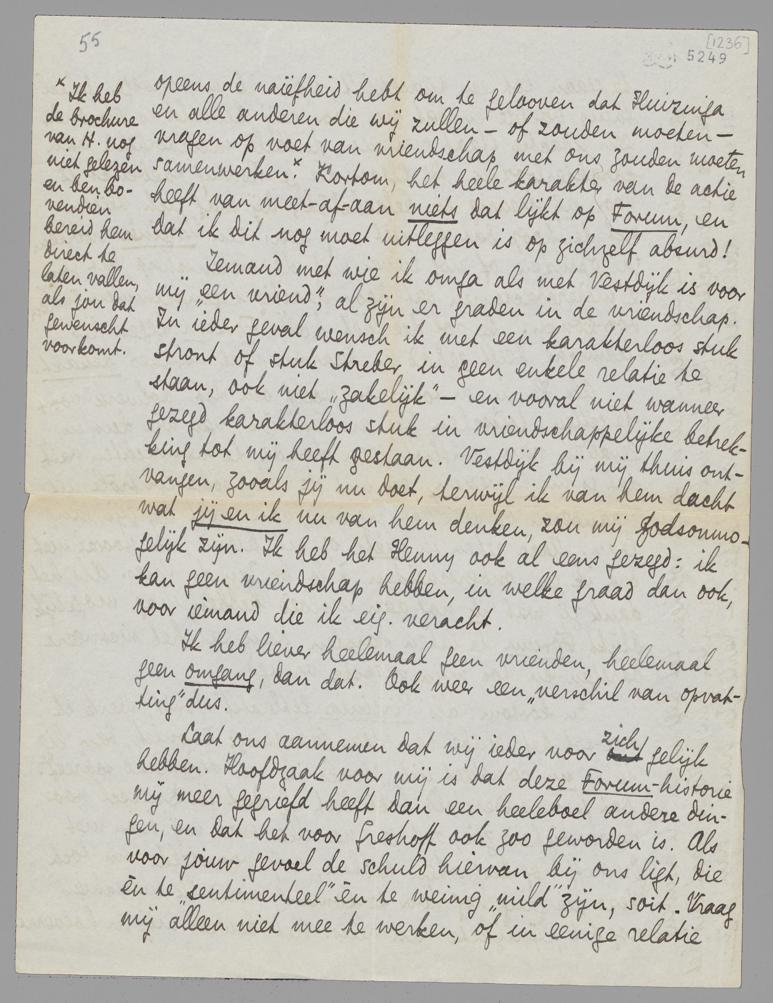 De vergelijking van een actie en masse, die ik als correspondent voor Vigilance tracht te bereiken, en waarin Kramers en Gans en wie maar verder wil en in aanmerking komt, meteen in het comité kunnen gaan zitten, met Forum, waarvan jij zelf telkens zei dat de vriendschapsverhouding de voornaamste kracht uitmaakte, is absurd. In een hollandsche organisatie tegen het fascisme wil ik geen enkele rol spelen behalve ‘ervoor doen wat ik kan’, hoofdzaak is dat er een massa tegen Mussert komt. De leiding daarvan komt vanzelf in handen van allerlei anderen en als het ons niet bevalt, betalen wij ons lidmaatschap en daarmee uit. Ik begrijp niet dat jij hier opeens de naïefheid hebt om te gelooven dat Huizinga en alle anderen die wij zullen - of zouden moeten - vragen op voet van vriendschap met ons zouden moeten samenwerken. [Ik heb de brochure van H. nog niet gelezen en ben bovendien bereid hem direct te laten vallen, als jou dat gewenscht voorkomt.] Kortom, het heele karakter van de actie heeft van meet-af-aan niets dat lijkt op Forum, en dat ik dit nog moet uitleggen is op zichzelf absurd!