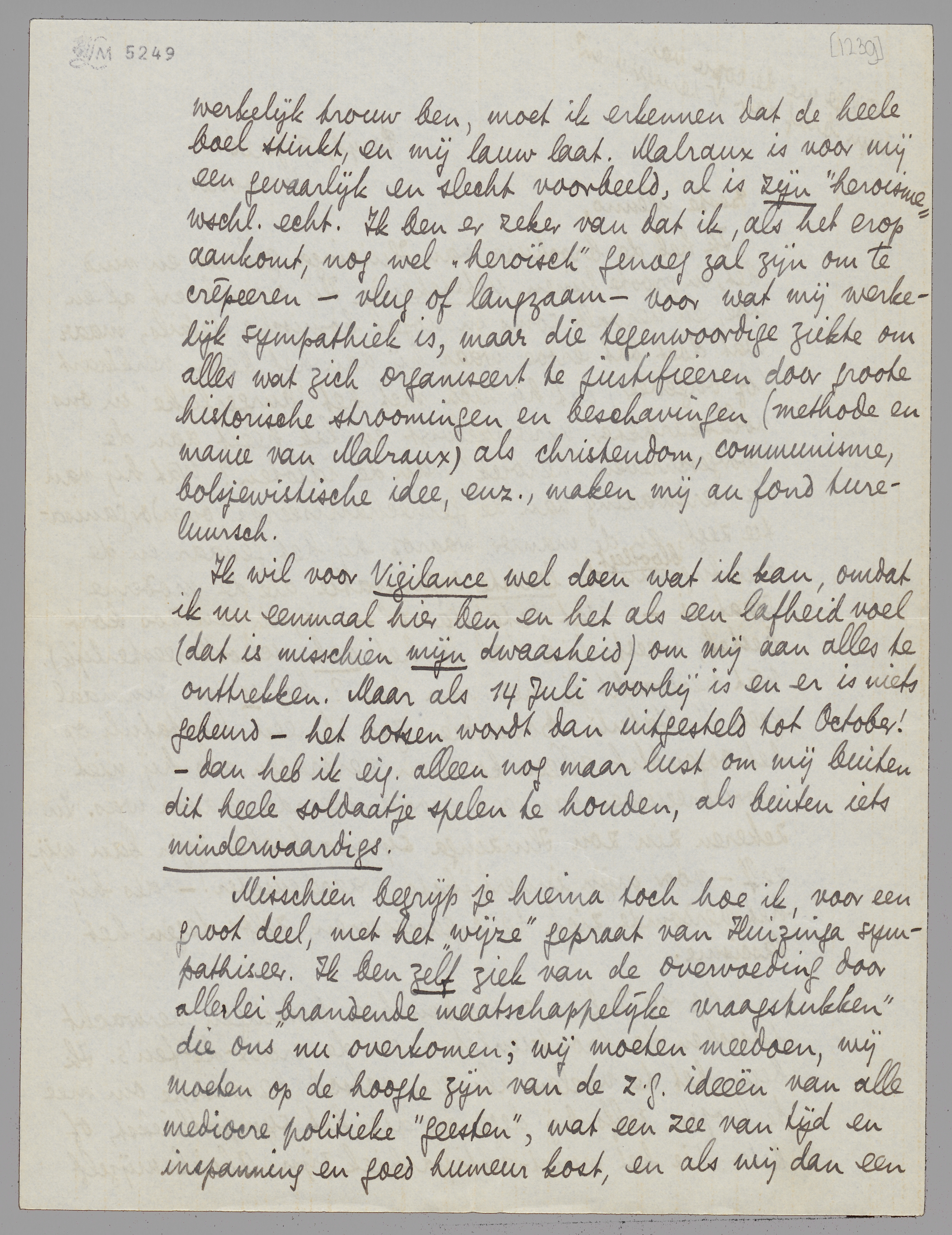 Misschien begrijp je hierna toch hoe ik, voor een groot deel, met het ‘wijze’ gepraat van Huizinga sympathiseer. Ik ben zelf ziek van de overvoeding door allerlei ‘brandende maatschappelijke vraagstukken’ die ons nu overkomen; wij moeten meedoen, wij moeten op de hoogte zijn van de z.g. ideeën van alle mediocre politieke ‘geesten’, wat een zee van tijd en inspanning en goed humeur kost, en als wij dan een béétje kritisch doordenken, moeten we ons tevreden stellen met wat ‘heroïsche’ mythen en voor ‘diepste stroomingen’ doorgaand kultuurhistorisch gelul. De ware moed is om het te verdommen een aandeel te hebben aan ‘deze tijd’.