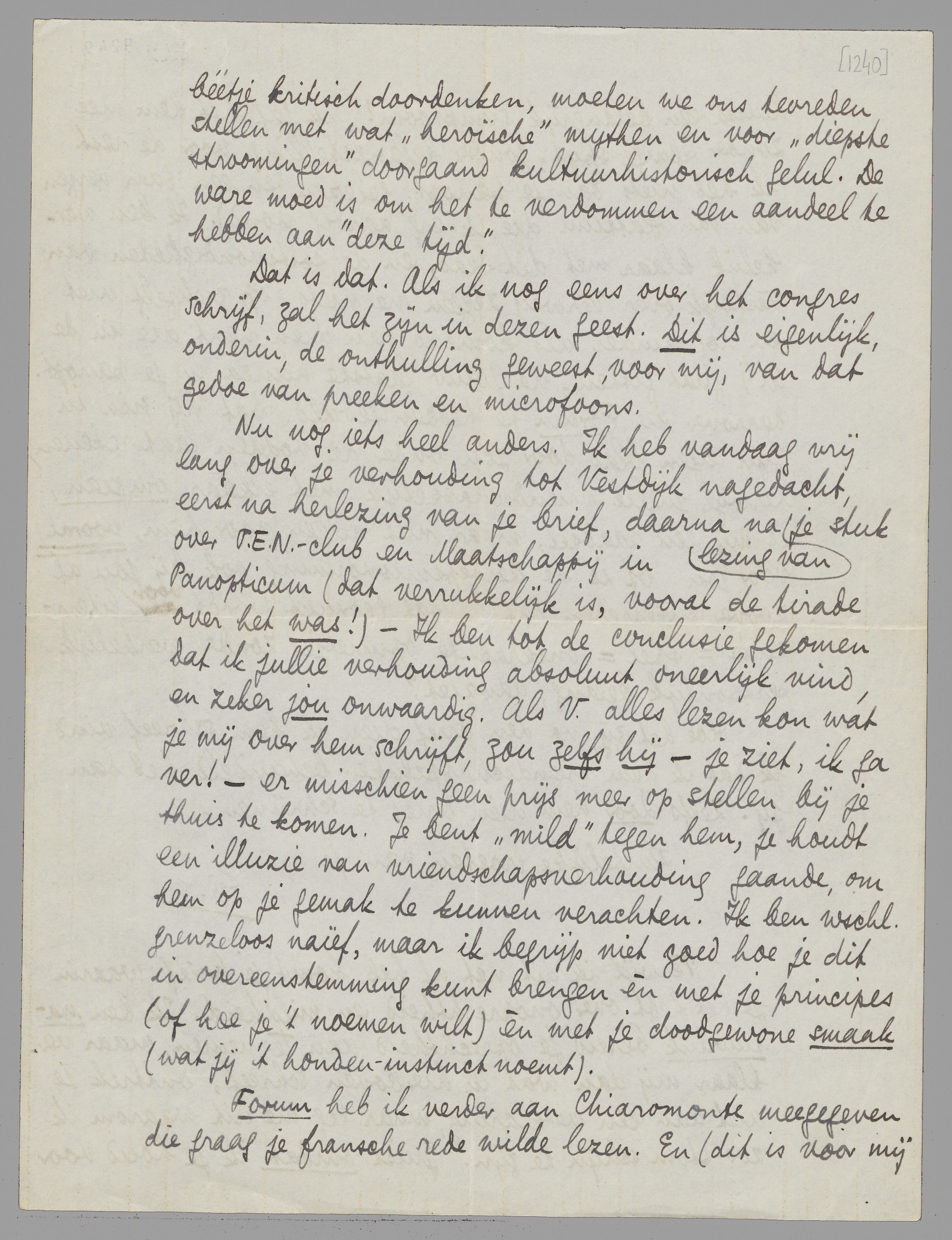 Nu nog iets heel anders. Ik heb vandaag vrij lang over je verhouding tot Vestdijk nagedacht, eerst na herlezing van je brief, daarna na lezing van je stuk over P.E.N.-club en Maatschappij in Panopticum (dat verrukkelijk is, vooral de tirade over het was!) - Ik ben tot de conclusie gekomen dat ik jullie verhouding absoluut oneerlijk vind, en zeker jou onwaardig. Als V. alles lezen kon wat je mij over hem schrijft, zou zelfs hij - je ziet, ik ga ver! - er misschien geen prijs meer op stellen bij je thuis te komen. Je bent ‘mild’ tegen hem, je houdt een illuzie van vriendschapsverhouding gaande, om hem op je gemak te kunnen verachten. Ik ben wschl. grenzeloos naïef, maar ik begrijp niet goed hoe je dit in overeenstemming kunt brengen èn met je principes (of hoe je 't noemen wilt) èn met je doodgewone smaak (wat jij 't honden-instinct noemt).