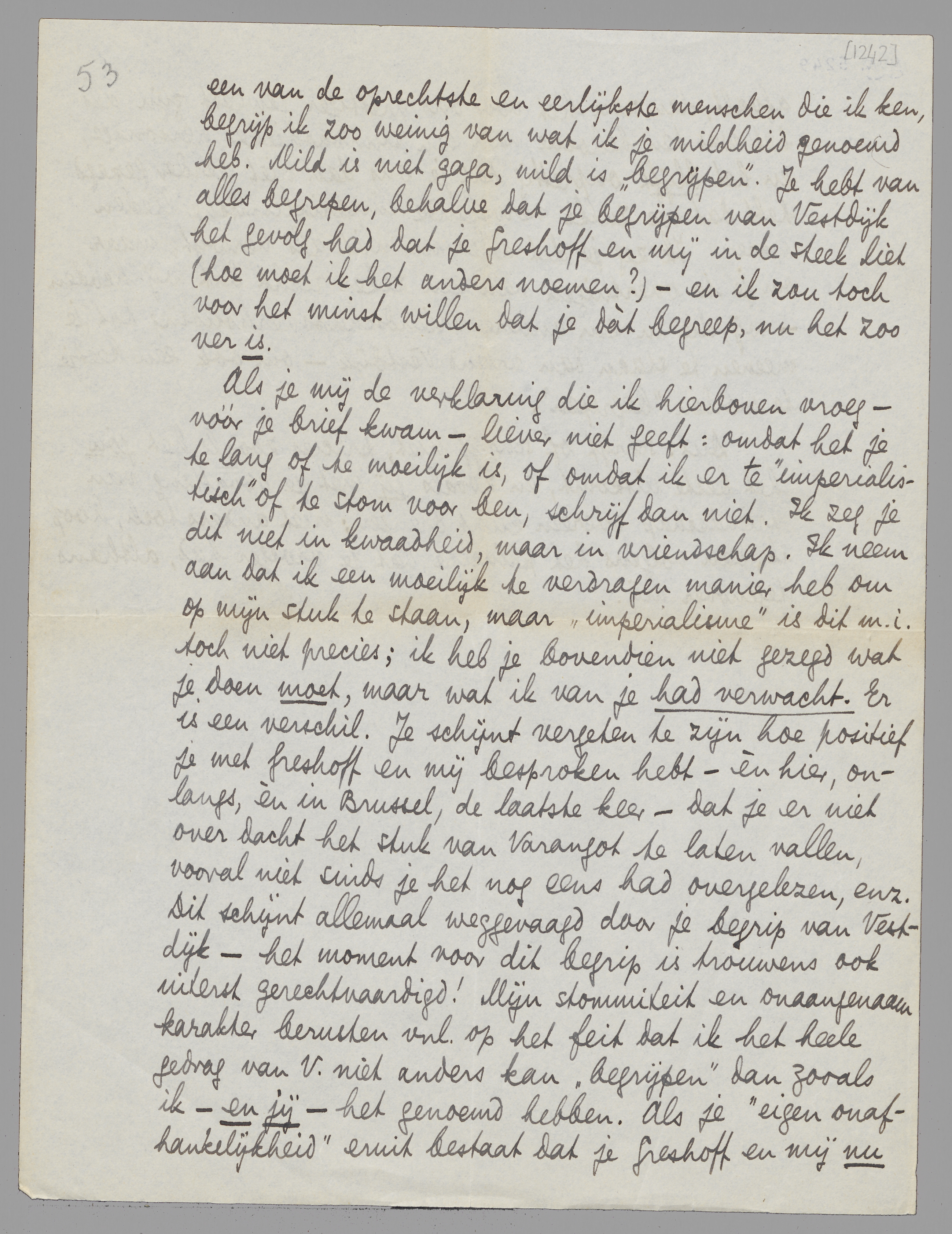 Als je mij de verklaring die ik hierboven vroeg - vóór je brief kwam - liever niet geeft: omdat het je te lang of te moeilijk is, of omdat ik er te ‘imperialistisch’ of te stom voor ben, schrijf dan niet. Ik zeg je dit niet in kwaadheid, maar in vriendschap. Ik neem aan dat ik een moeilijk te verdragen manier heb om op mijn stuk te staan, maar ‘imperialisme’ is dit m.i. toch niet precies; ik heb je bovendien niet gezegd wat je doen moet, maar wat ik van je had verwacht. Er is een verschil. Je schijnt vergeten te zijn hoe positief je met Greshoff en mij besproken hebt - èn hier, onlangs, èn in Brussel, de laatste keer - dat je er niet over dacht het stuk van Varangot te laten vallen, vooral niet sinds je het nog eens had overgelezen, enz. Dit schijnt allemaal weggevaagd door je begrip van Vestdijk - het moment voor dit begrip is trouwens ook uiterst gerechtvaardigd! Mijn stommiteit en onaangenaam karakter berusten vnl. op het feit dat ik het heele gedrag van V. niet anders kan ‘begrijpen’ dan zooals ik - en jij - het genoemd hebben. Als je ‘eigen onafhankelijkheid’ eruit bestaat dat je Greshoff en mij nu afvalt, dan zou het voor ons prettiger geweest zijn als het was ten behoeve van een sympathieker personage, en het blijft onprettig dat je ons dan niet eerder gezegd hebt dat we zulke vervelende imperialistische lieden waren. Ik zeg je dit alles nu niet als verwijt, maar om je te overtuigen van een zeker recht dat wij hebben - wij, die in een andere vriendschapsverhouding tot je meenen te staan dan vriend Vestdijk - om ook een beetje te worden ‘begrepen’.