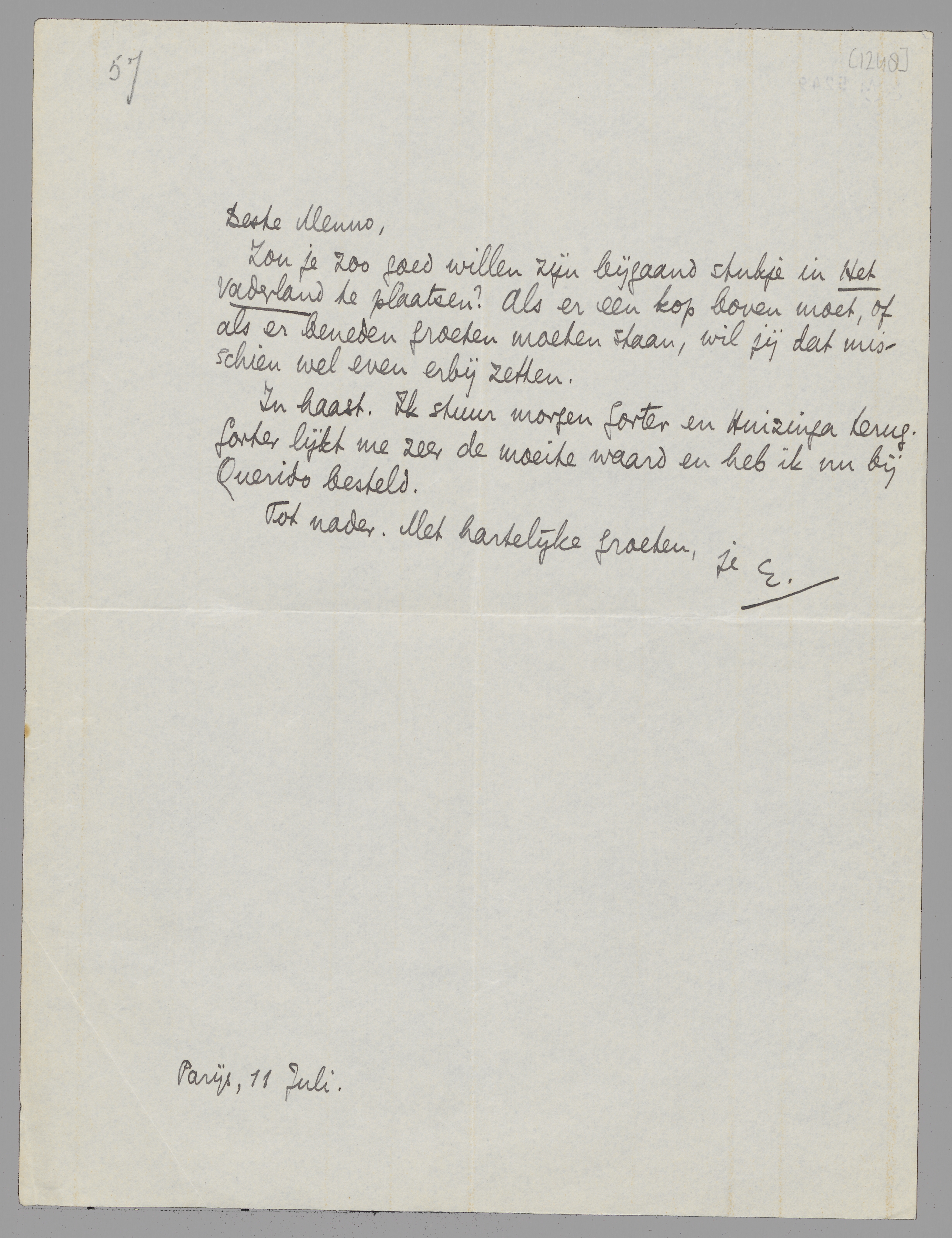 In haast. Ik stuur morgen Gorter en Huizinga terug. Gorter lijkt me zeer de moeite waard en heb ik nu bij Querido besteld.